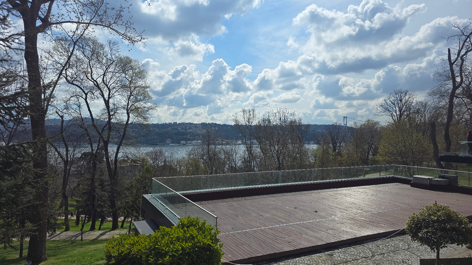 The image depicts a view from a raised wooden deck with a glass railing, overlooking the Bosphorus Strait in Sarıyer, Turkey. The deck is lined with vegetation and a small manicured tree is situated…read more