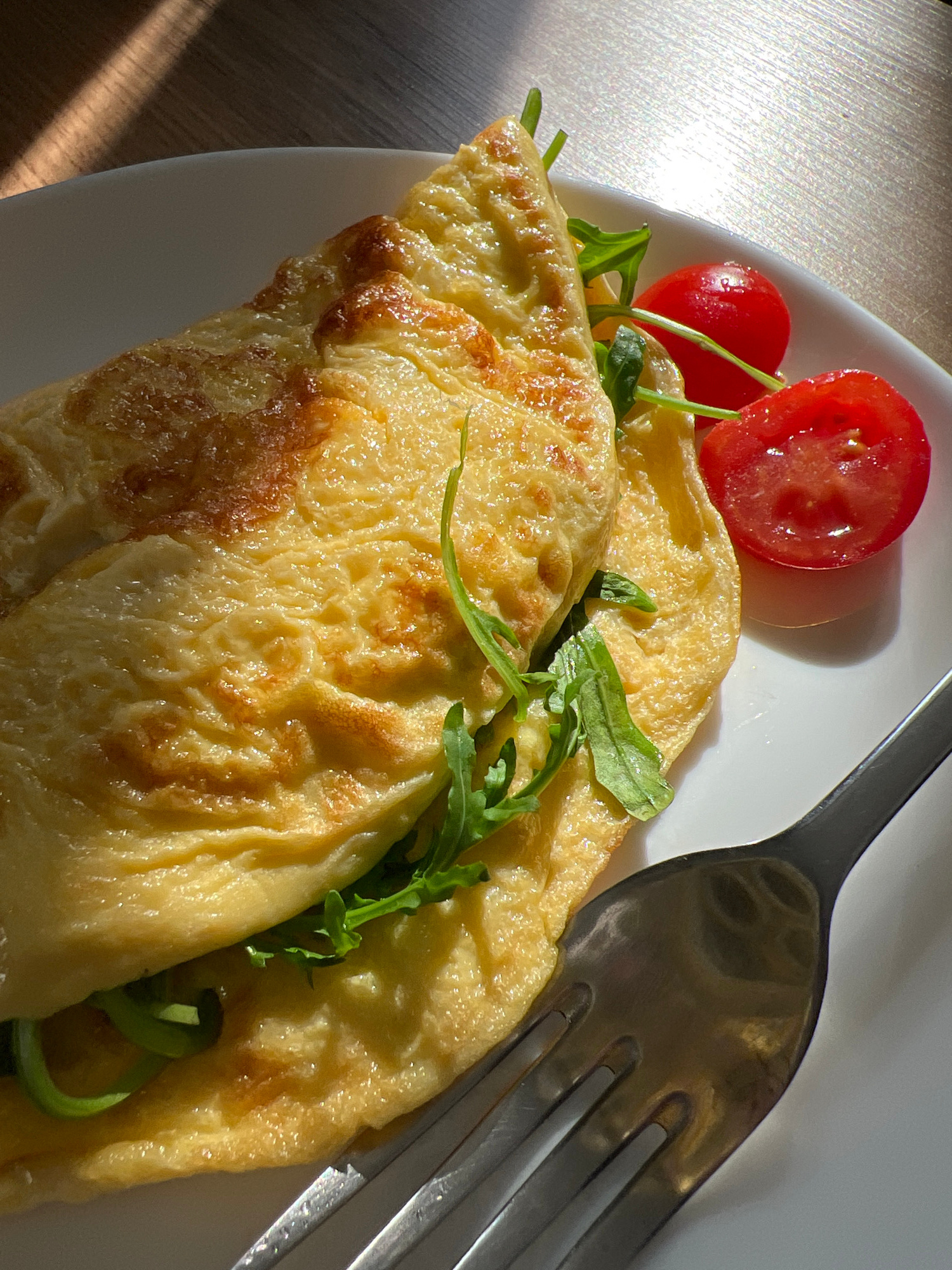 A plate contains a folded omelet garnished with arugula and sliced cherry tomatoes, with a fork placed beside it. The plate is white and reflects light, suggesting a shiny or glossy surface. The omele…read more
