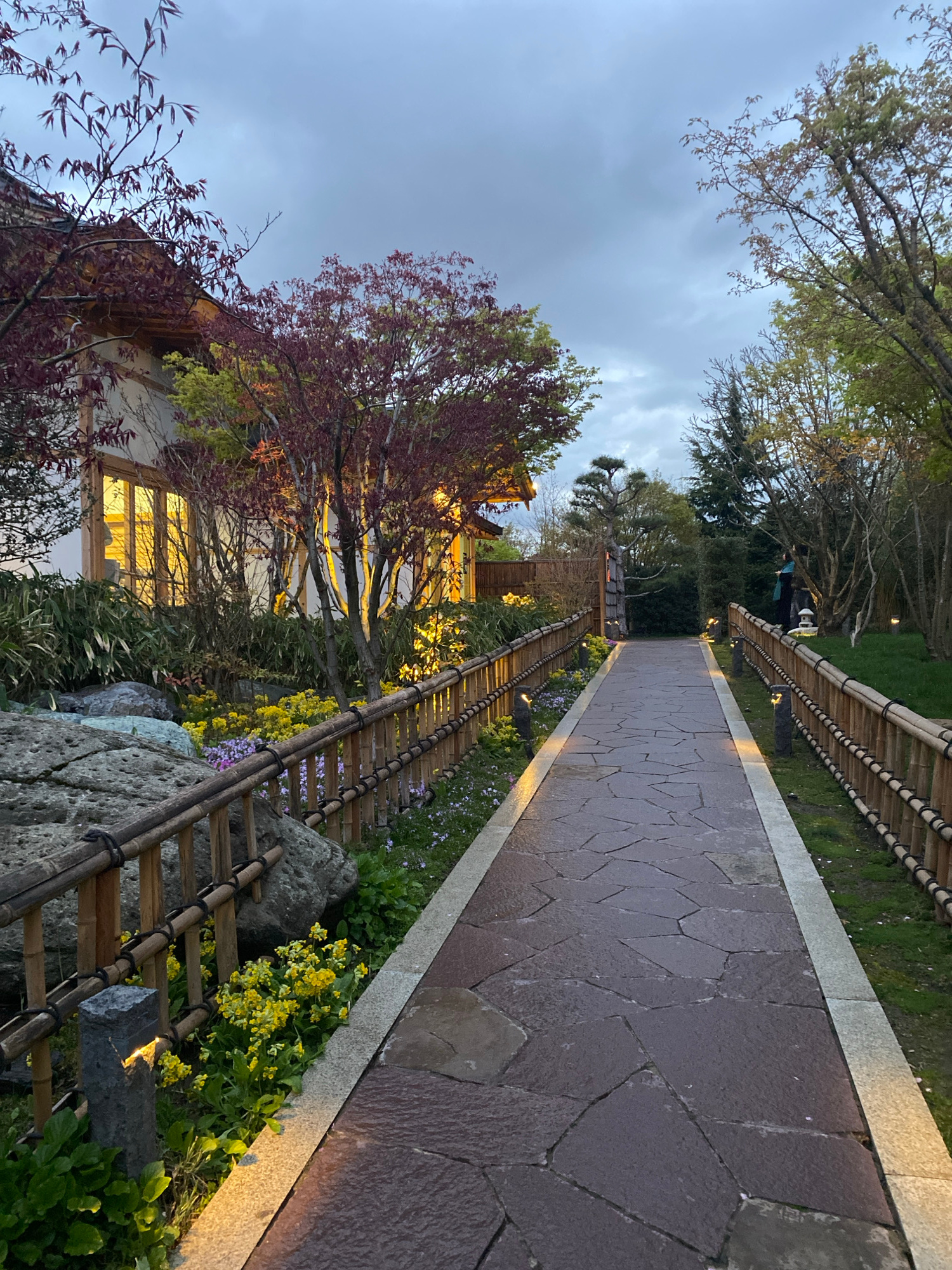 The image shows a stone pathway leading through a garden at dusk. A low bamboo fence borders the path on both sides, and lights illuminate the edges. The path is lined with greenery including yellow a…read more