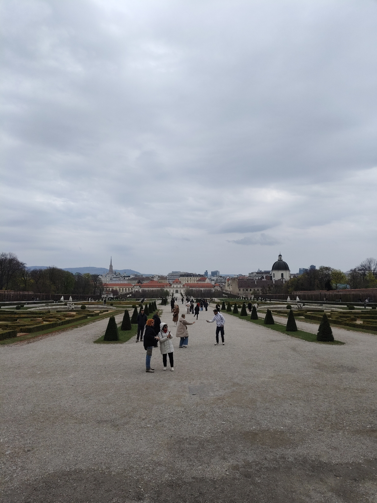 The image shows a gravel path leading through a formal garden towards buildings in the distance. The scene is in Vienna, Austria, specifically at the Belvedere Palace gardens, recognizable by the symm…read more