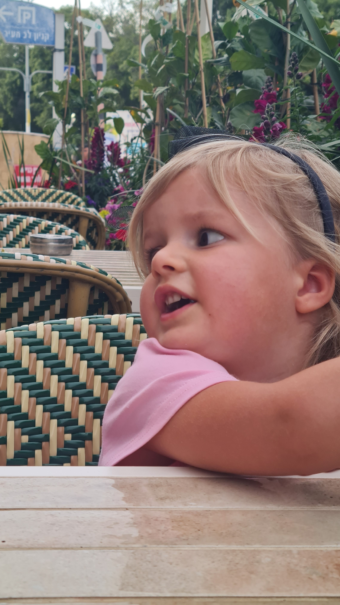 A photograph captures a young, blonde-haired girl with a black headband, wearing a pink shirt. Her expression is lively, with an open mouth and eyes looking slightly to the left. She leans against wha…read more