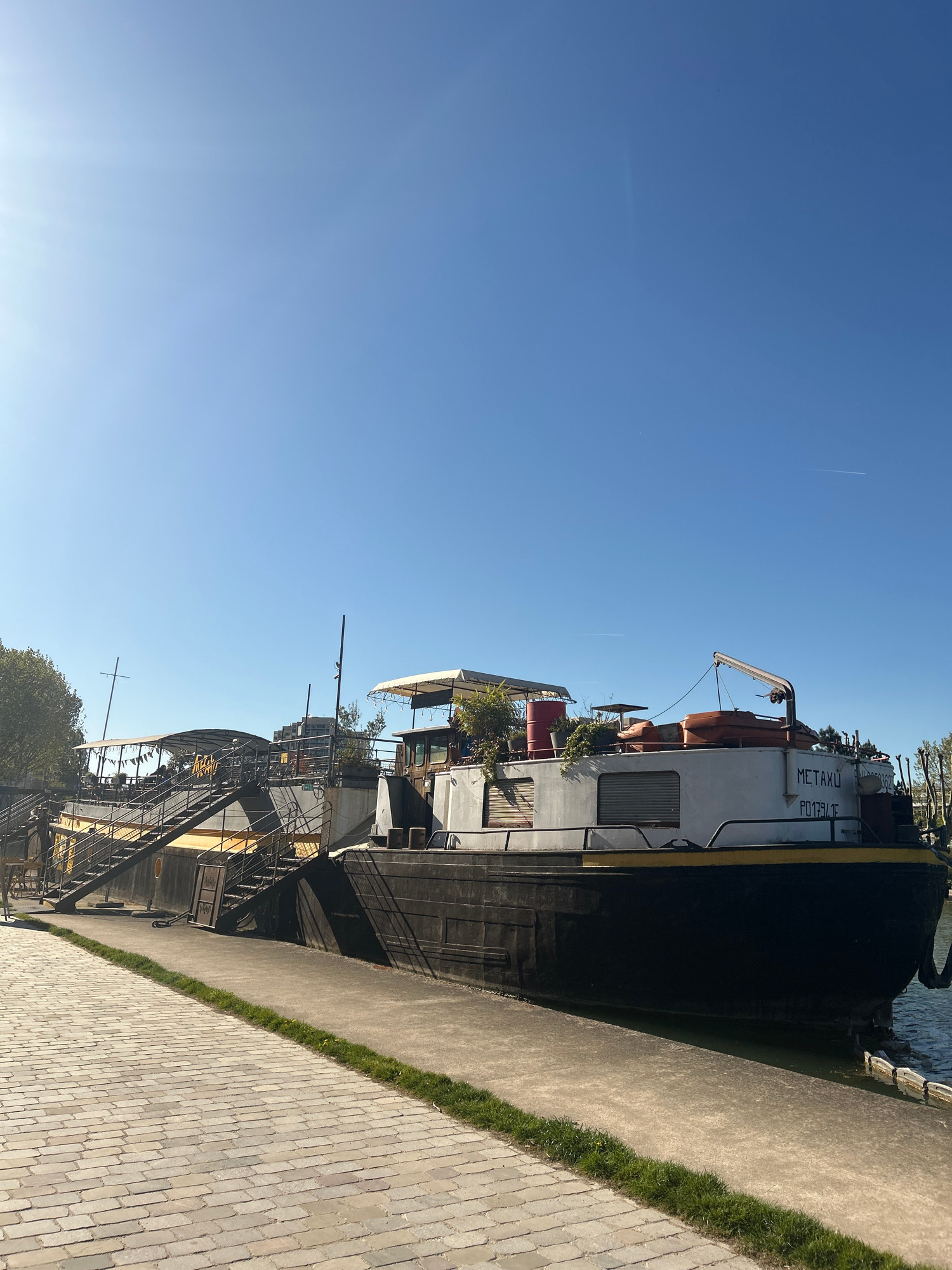 A barge, named "Metaku Pont Rouge," is docked on a canal in Pantin, France. The barge is black and white with multiple levels and a small garden. A set of stairs connects the barge to the dock, which…read more