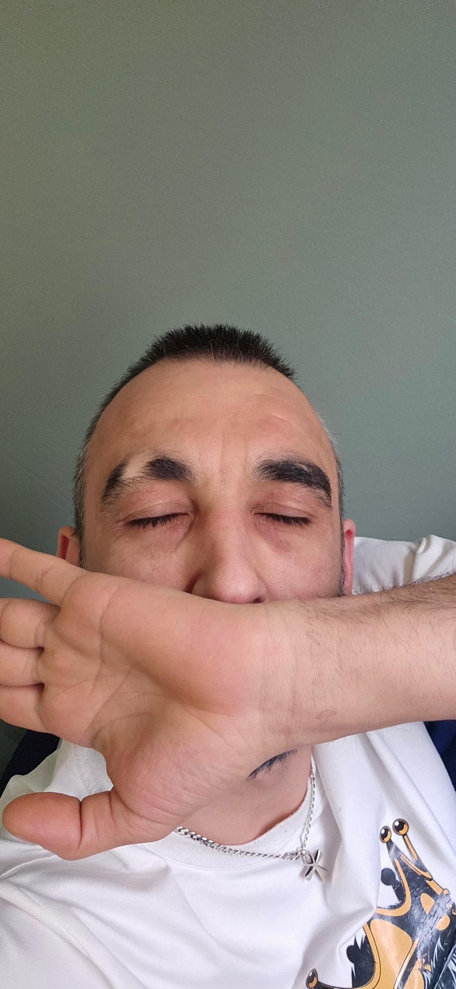 A man with short, dark hair and closed eyes is holding his hand over his face. He is wearing a white t-shirt with a print on it and a silver chain with a pendant. The background is a plain gray wall.…read more