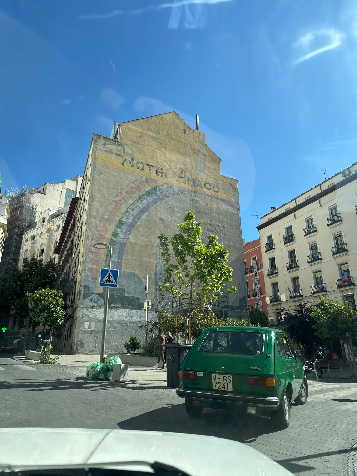 The image shows a street scene in Madrid, Spain. A faded advertisement for "HOTEL ANACO" is painted on the side of a tall building with a rainbow design. A green vintage car with the license plate "M-…read more