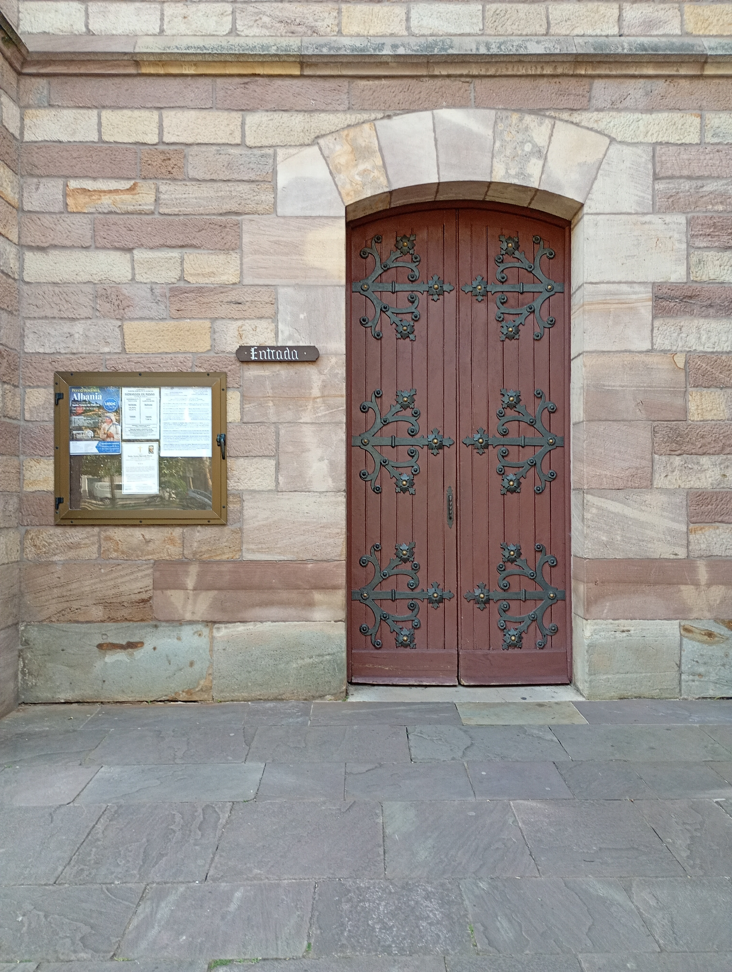 The image depicts the exterior of a building with a reddish-brown, arched wooden door adorned with decorative black metalwork. To the left of the door is a bulletin board enclosed in a bronze frame, dā¦read more
