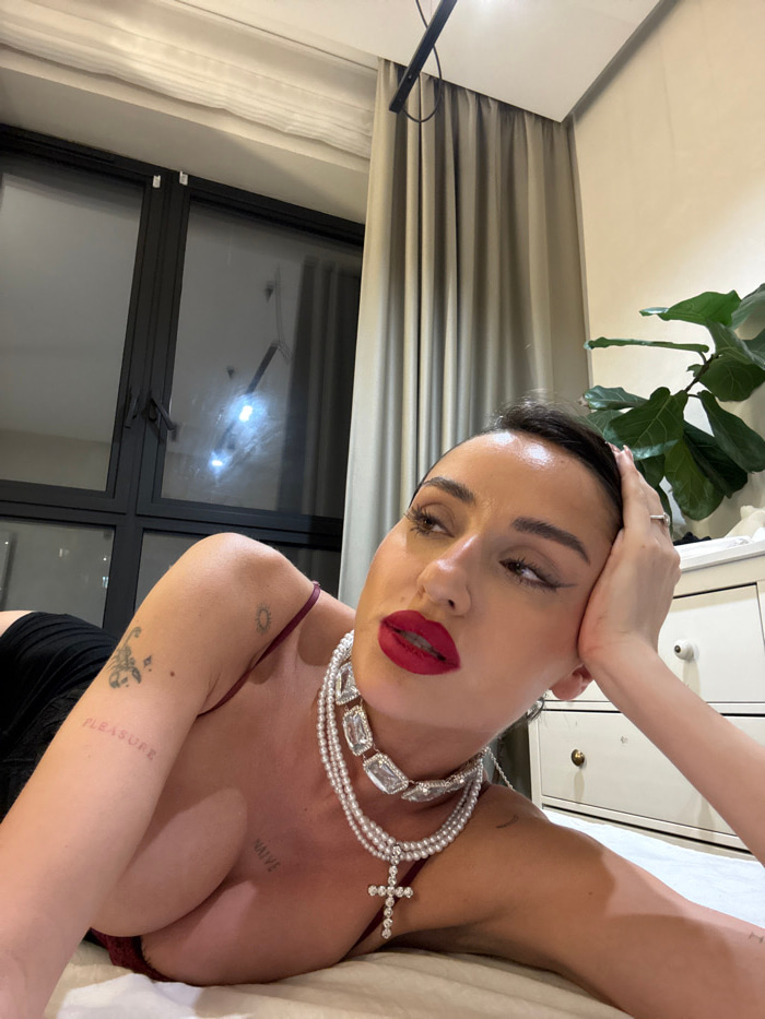A female individual is depicted indoors, lying on her left side on a light-colored surface, positioned against a backdrop that includes a window and interior furnishings. She faces upwards and towards…read more