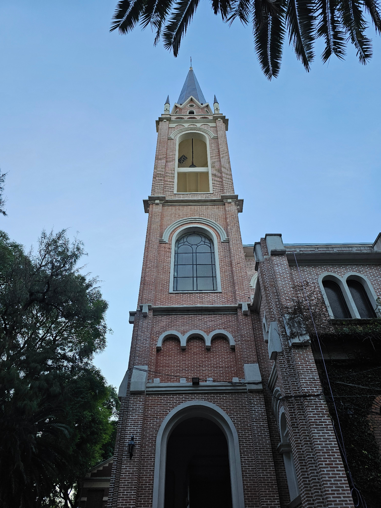 A low-angle, upward-facing shot showcases the brick exterior of a church tower, its steeple reaching into a clear blue sky. The tower features arched windows and decorative brickwork. Palm fronds fram…read more