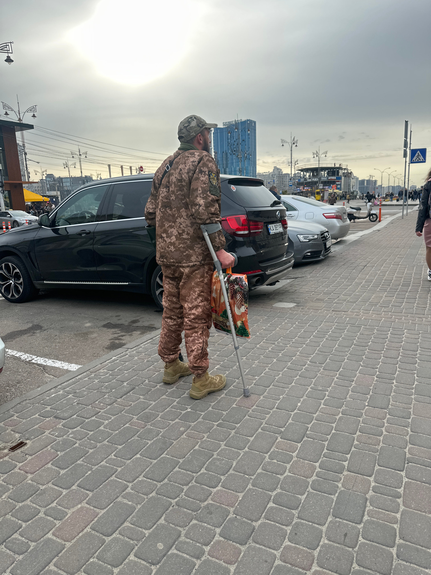 An individual in military-style camouflage fatigues stands on a paved sidewalk next to parked cars in an urban setting. The person, who appears to be an adult, is using a single crutch and carrying a…read more