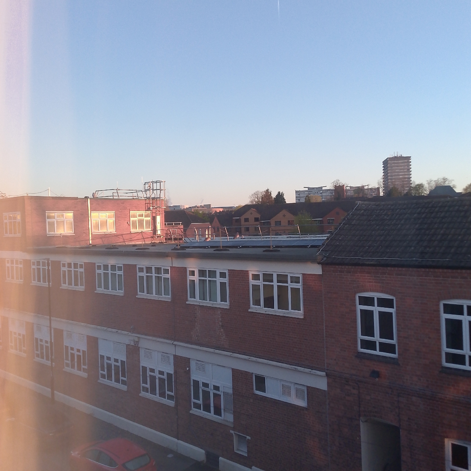 The photograph depicts a three-story brick building with white-framed windows, possibly an educational or institutional building, viewed from an elevated position. On the roof are some solar panels.…read more