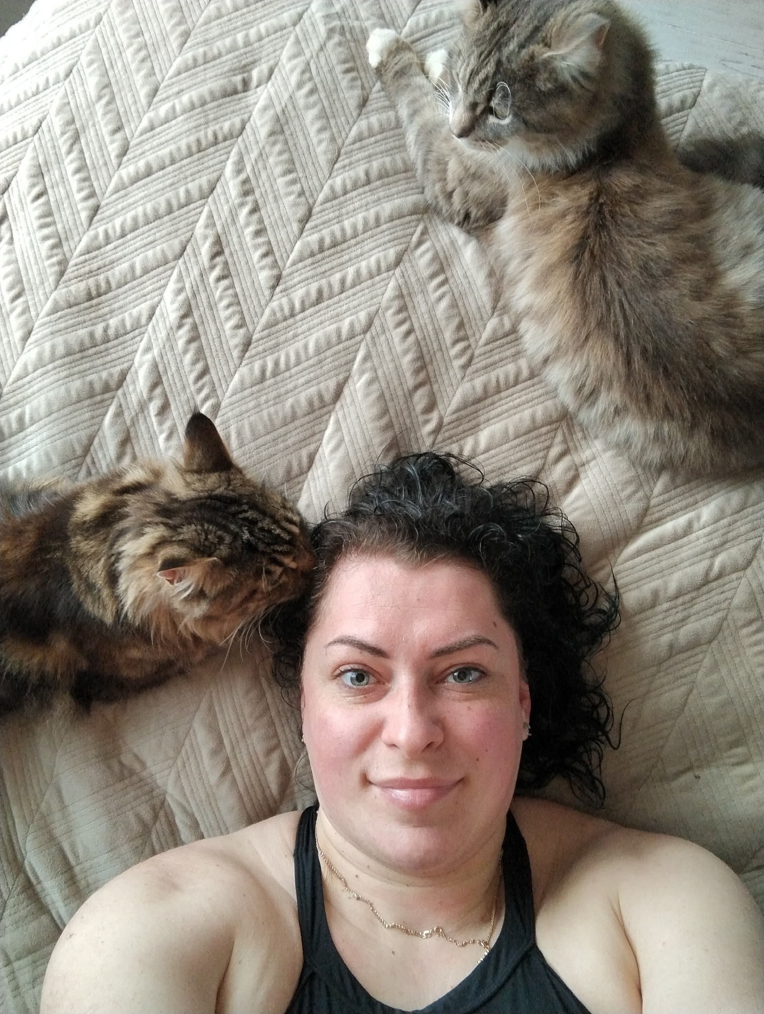 A woman with curly dark hair and blue eyes is lying on a tan-colored, textured quilt. She is wearing a black tank top and a delicate gold necklace. To her left, a brown tabby cat rests its head near h…read more