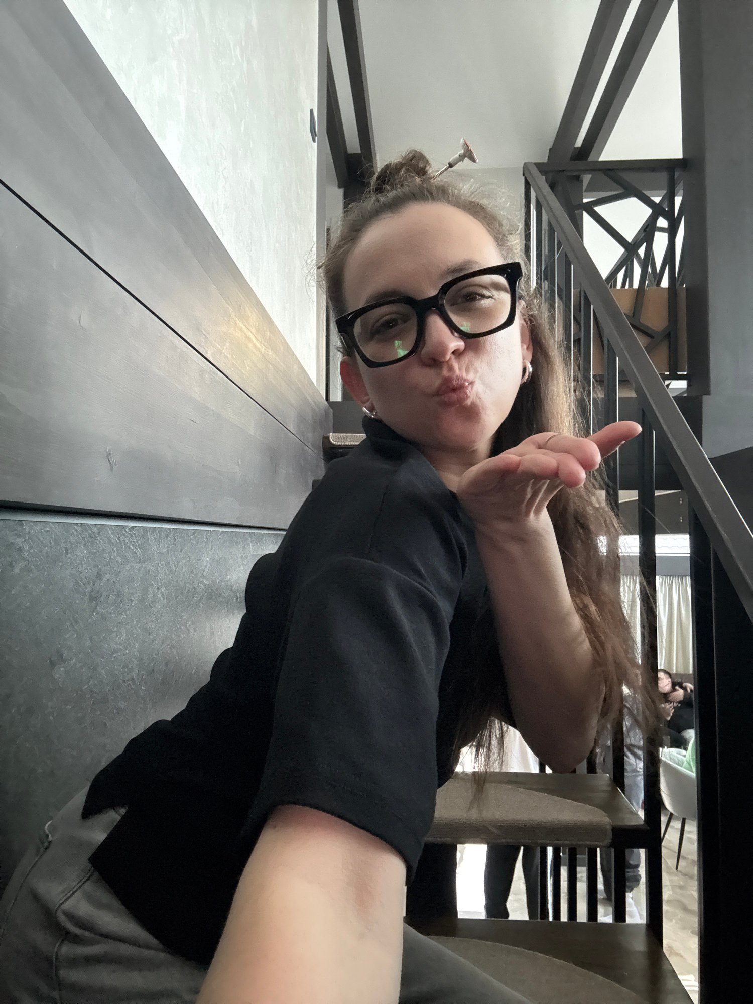 The image is a sideways-oriented indoor selfie. A person with long, brown hair, wearing black-framed glasses, a black top, and grey pants, looks towards the camera with puckered lips, making a "kiss"…read more
