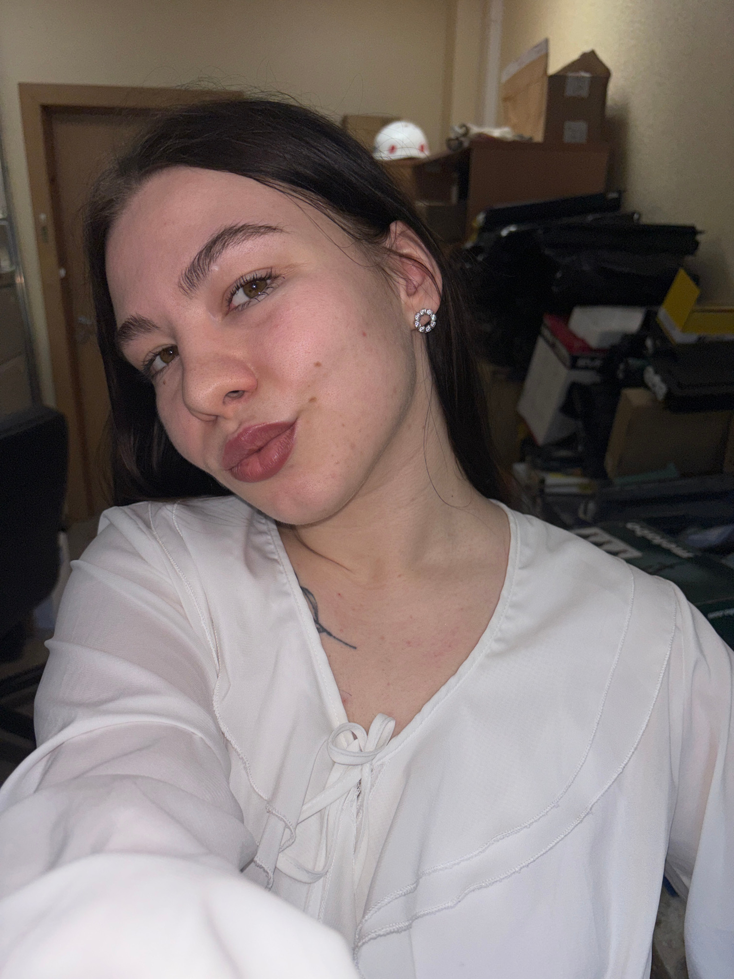 A woman with dark hair is facing the camera in an indoor setting. She has fair skin and is wearing a white blouse with tie details at the neckline. Her ear is visible, adorned with a round earring. A…read more