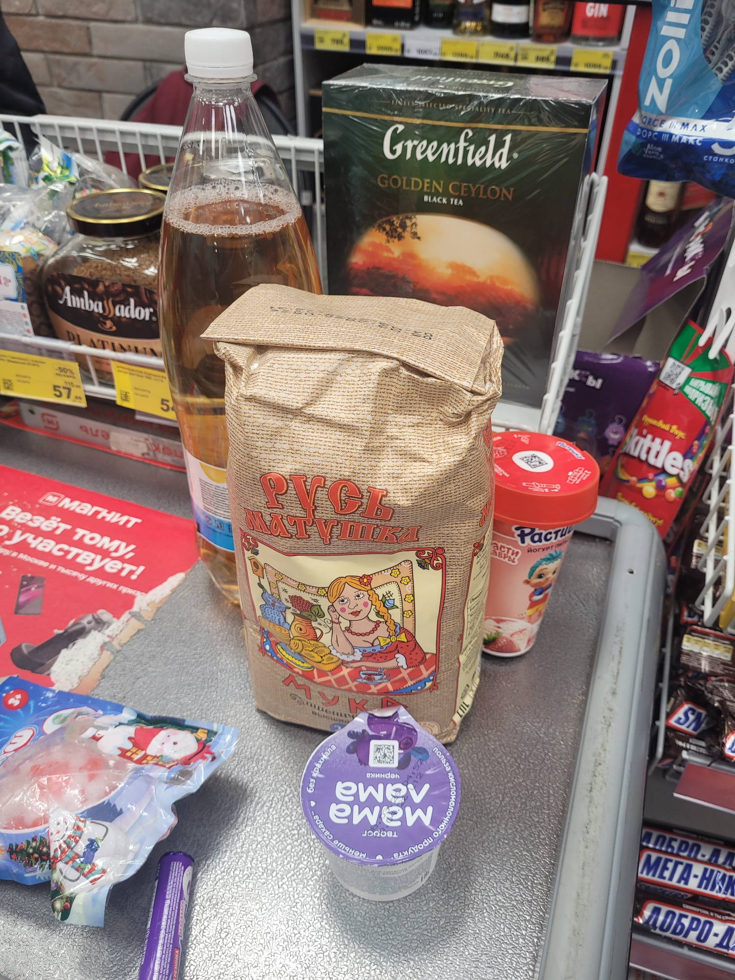 The image shows a close-up of groceries at a checkout counter, seemingly in a supermarket or grocery store. The scene is likely in Izhevsk, Russia based on the presence of Russian text on the products…read more