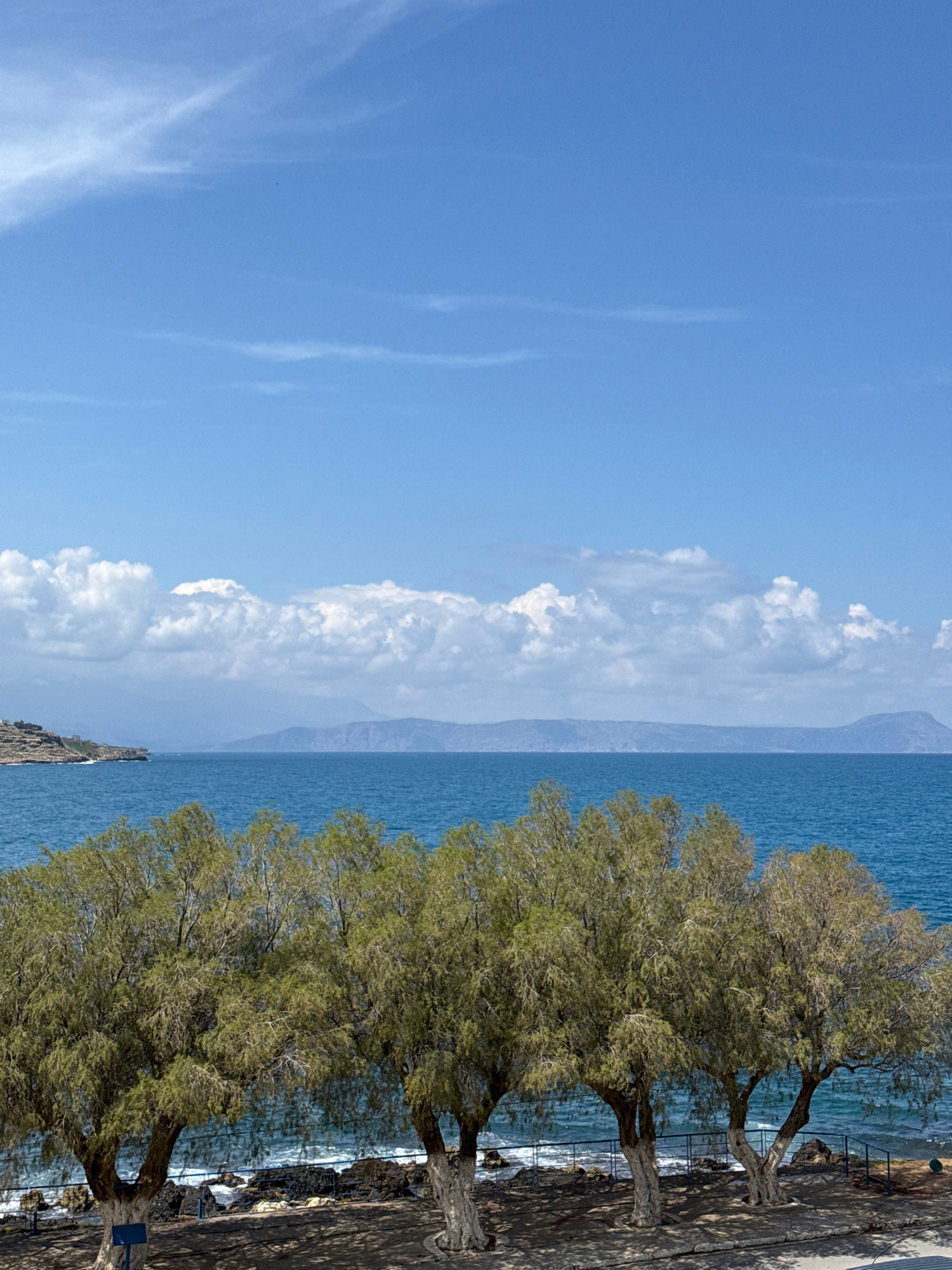 The image depicts a seaside scene in Rethymno, Greece. The sky, transitioning from a clear blue to cumulus clouds, occupies the left half. The sea is a deep blue, with a visible shoreline and a mounta…read more