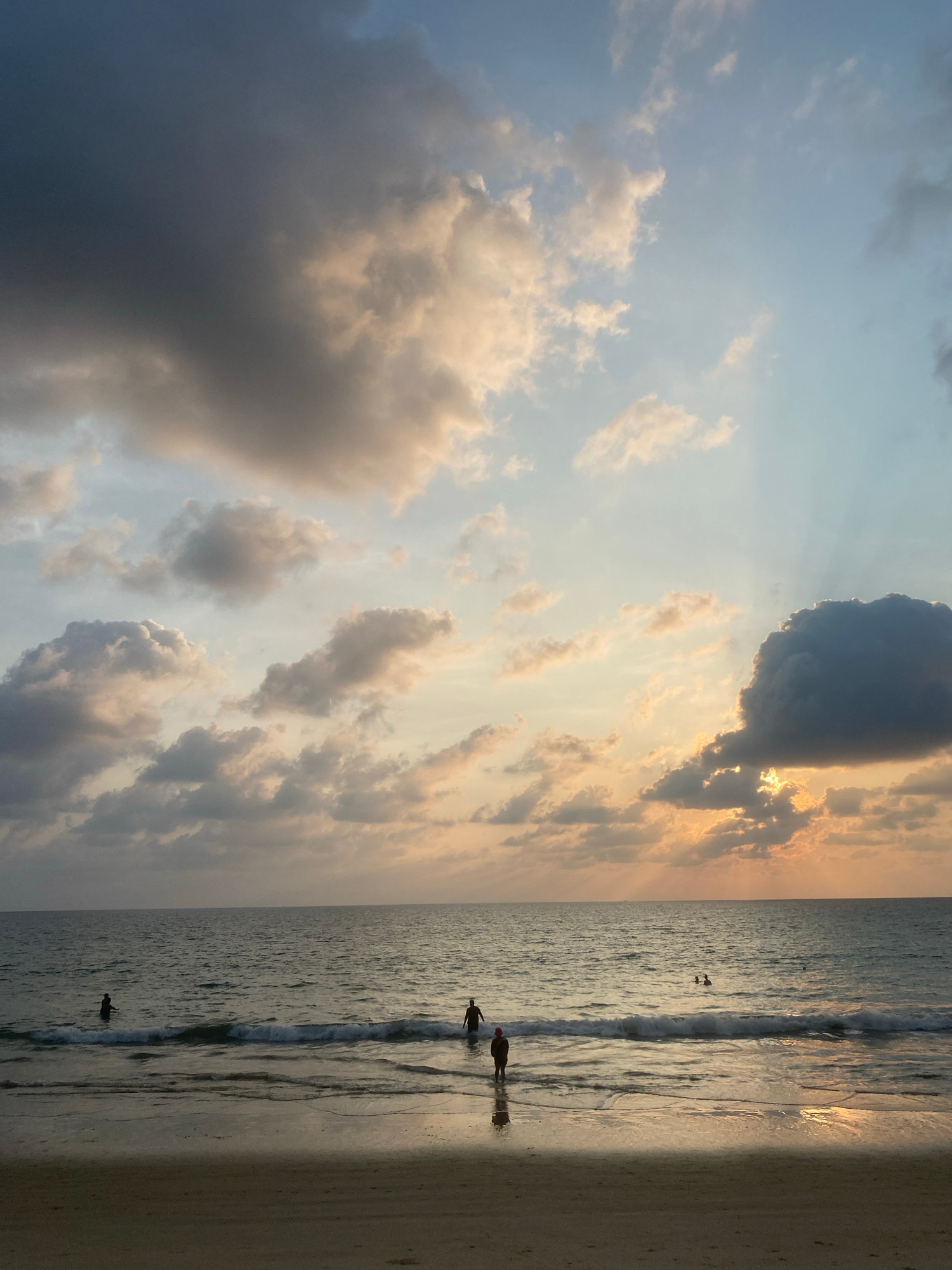 This media file captures a serene beach scene at either sunrise or sunset in Choeng Thale, Thailand. The sky dominates the upper portion, featuring a mix of dramatic, dark clouds and softer, lighter cā¦read more