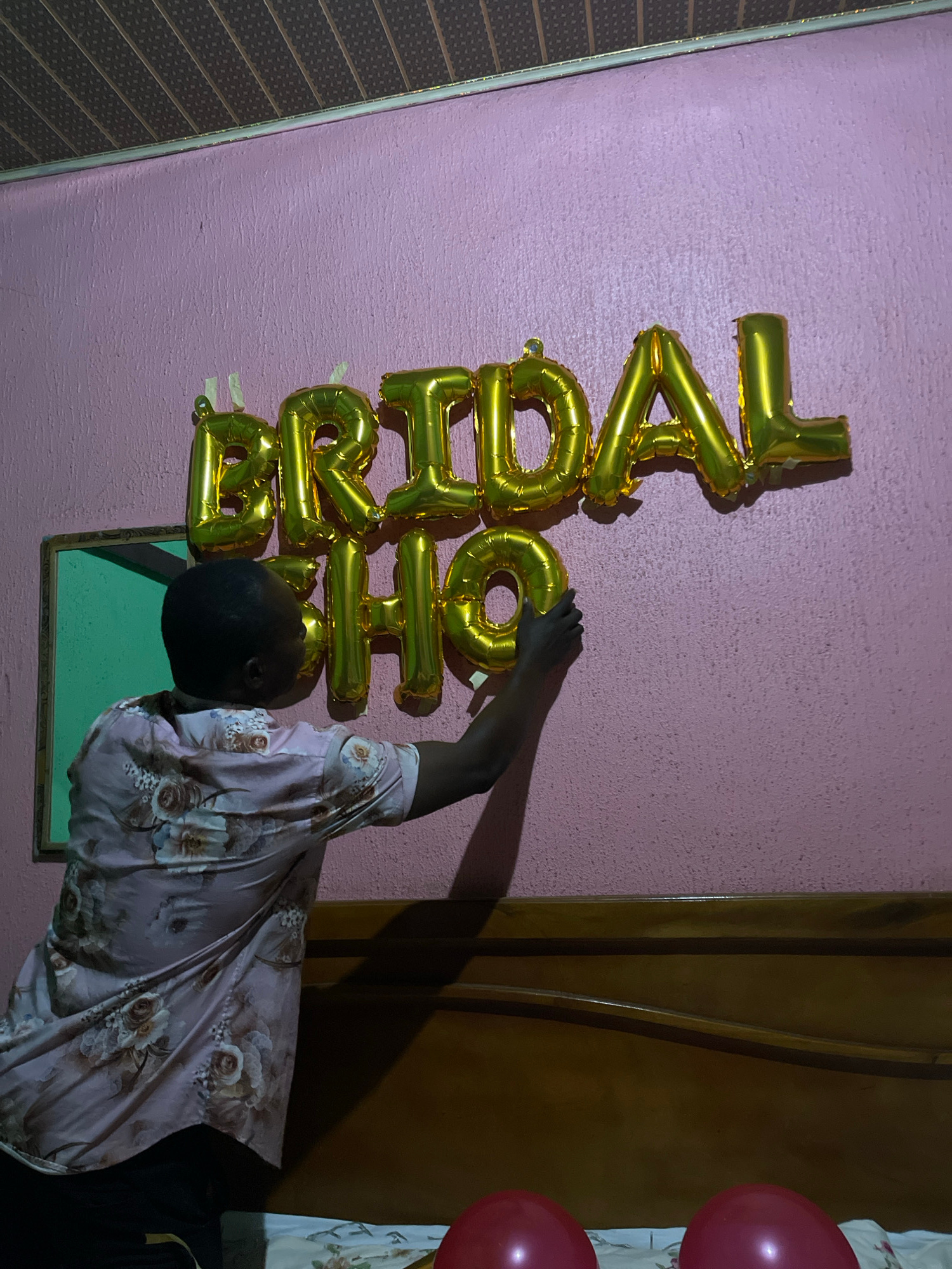 A person is arranging "Birthday" balloons on a pink wall in Akwanga, Nigeria. Two red balloons are visible on the right side of the frame. A mirror is mounted on the wall below the balloons, reflectin…read more