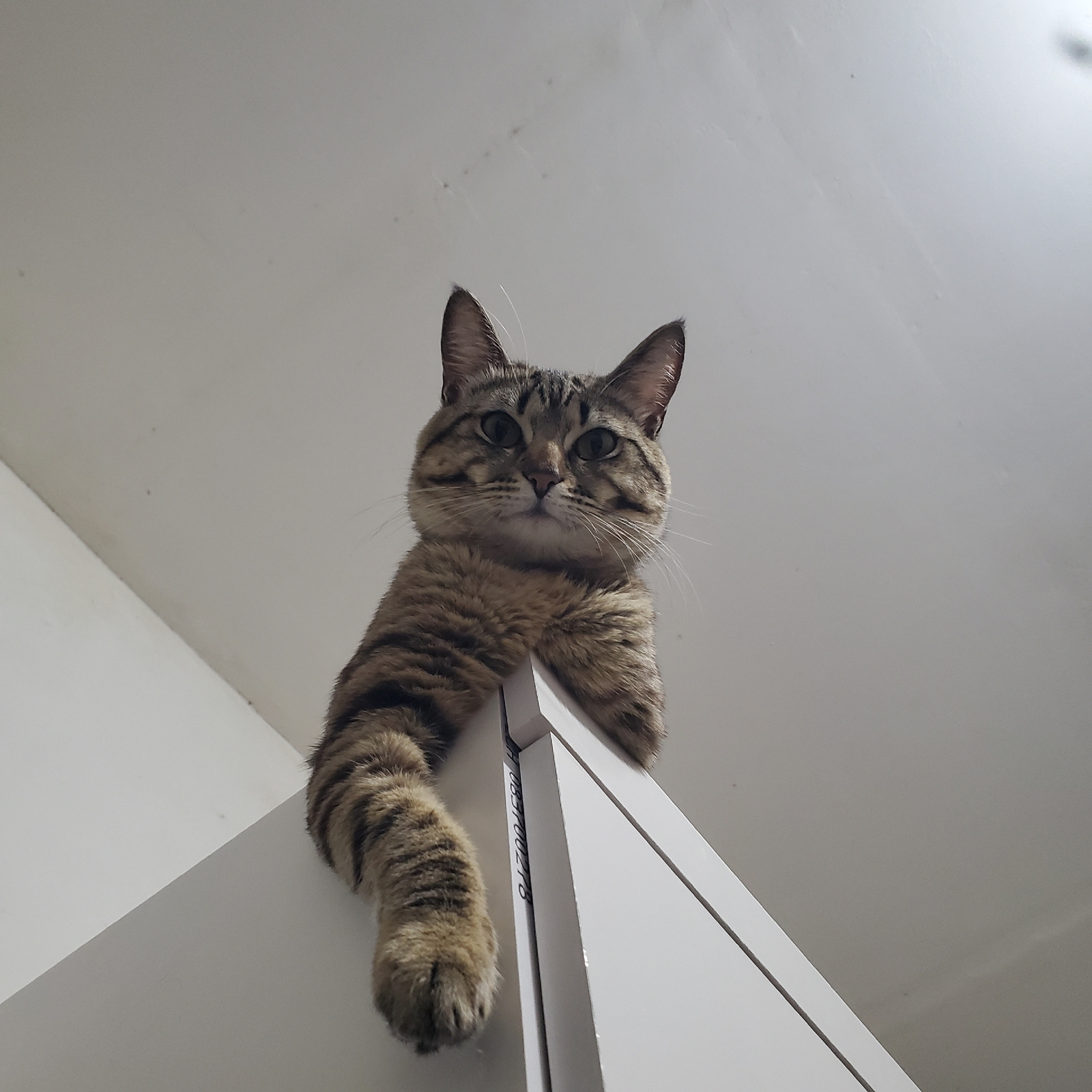 A low-angle shot depicts a brown tabby cat perched on the edge of a white cabinet or shelf. The cat is leaning forward, looking down towards the viewer with its paws dangling over the edge. The backgr…read more