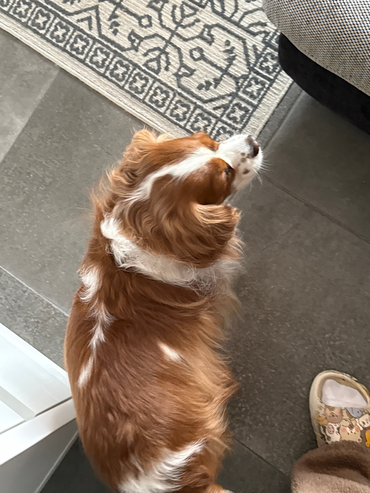 An indoor, high-angle shot captured in Sofia, Bulgaria, features a tan and white dog, likely a Cavalier King Charles Spaniel, looking upwards. The dog's long, wavy fur is predominantly golden-brown wi…read more