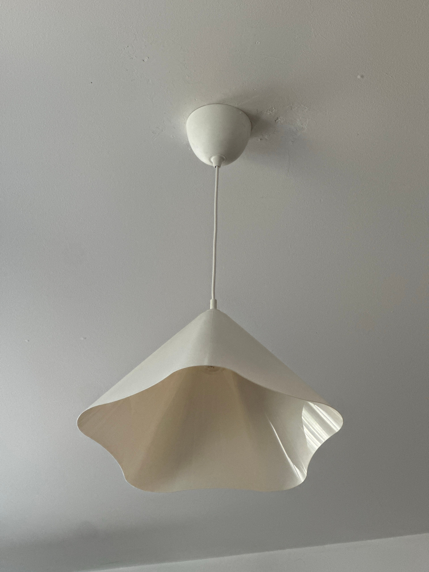 A white pendant lamp with a bulbous base and a long, thin stem terminating in a flower-shaped lampshade is affixed to a white ceiling. The ceiling exhibits minor imperfections, including small raised…read more