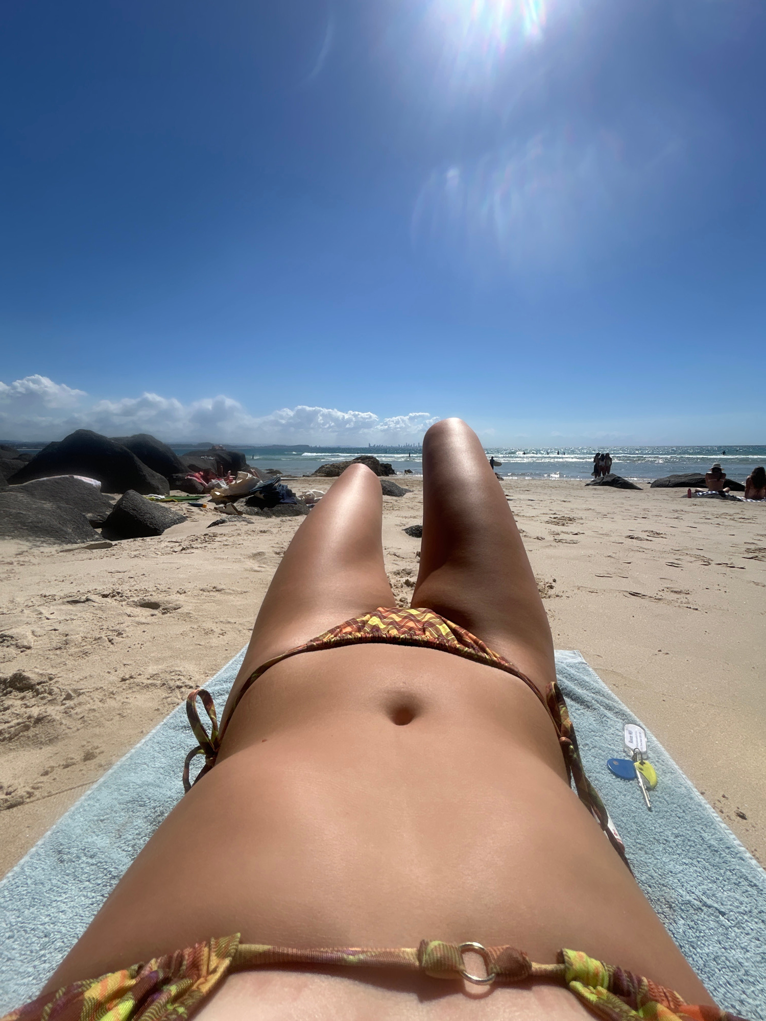 The image shows a woman lying on a beach in Coolangatta, Australia. The woman is wearing a bikini and is lying on a blue towel on the sand. The beach is crowded with people, and there are rocks and bu…read more