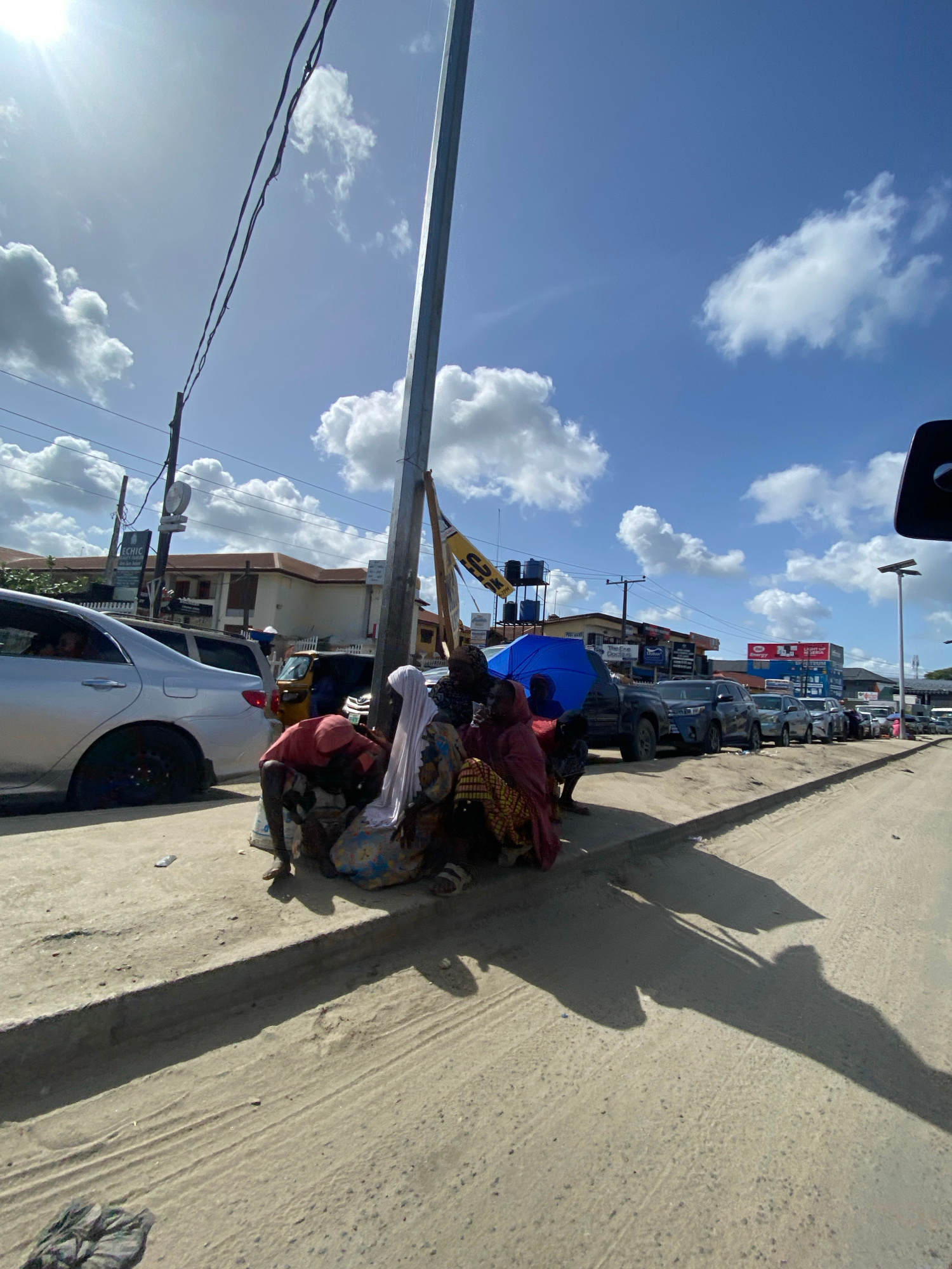 A photograph shows a street scene in Ado, Nigeria. Several people are gathered under a blue umbrella next to a silver car parked along the side of the road. The sky is bright blue with white clouds. B…read more