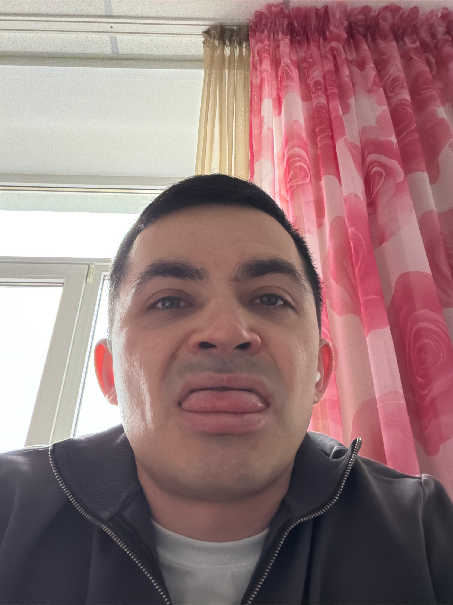 A man is depicted in a selfie, sticking his tongue out. He is wearing a white t-shirt and a dark gray jacket with a visible zipper. Behind him is a window, partially obscured by a beige blind and pinkβ¦read more