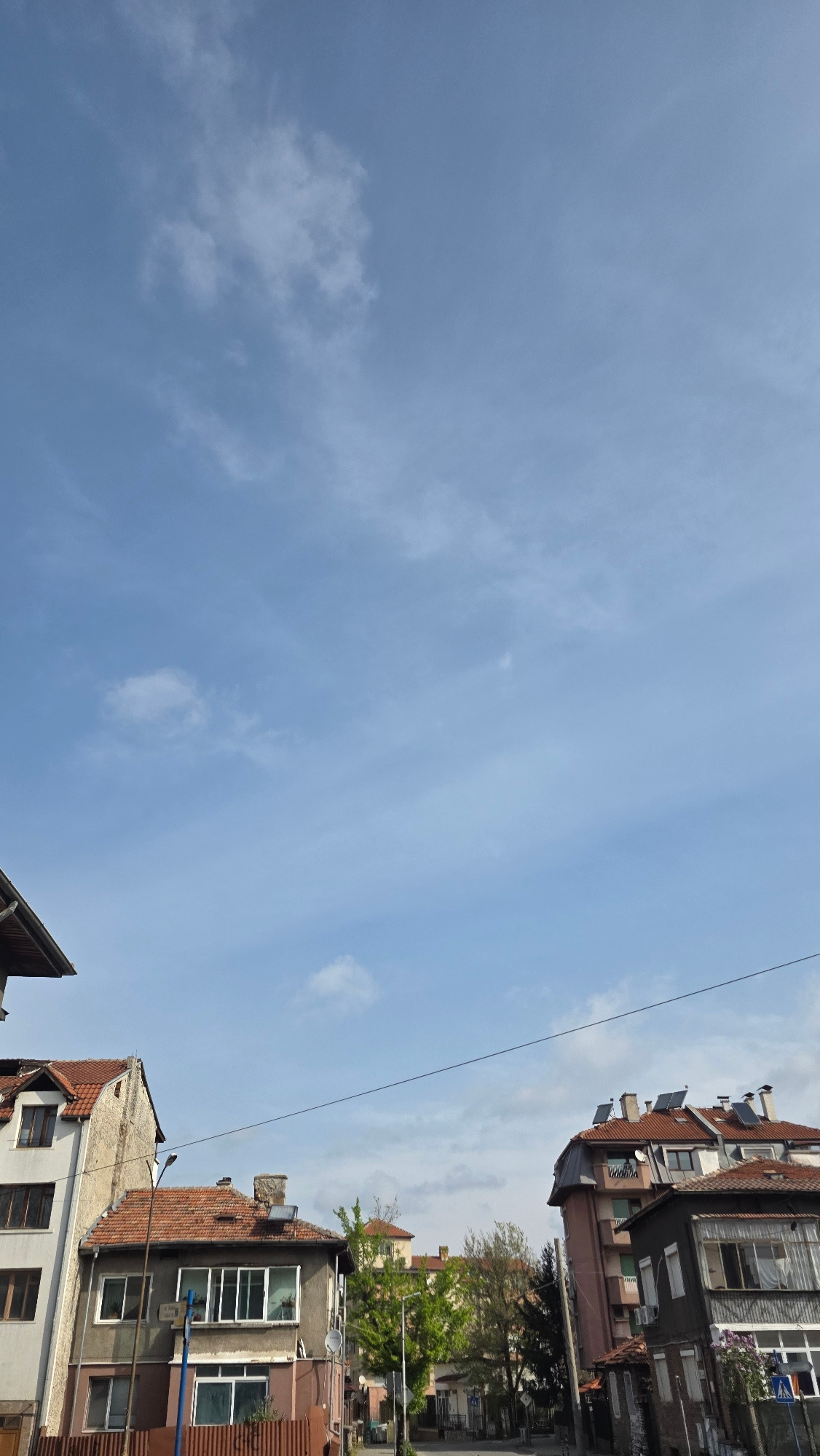 The image shows a street scene in Blagoevgrad, Bulgaria, viewed from a low angle, looking upwards. The perspective is framed by buildings on either side and the open sky in the center. The buildings a…read more