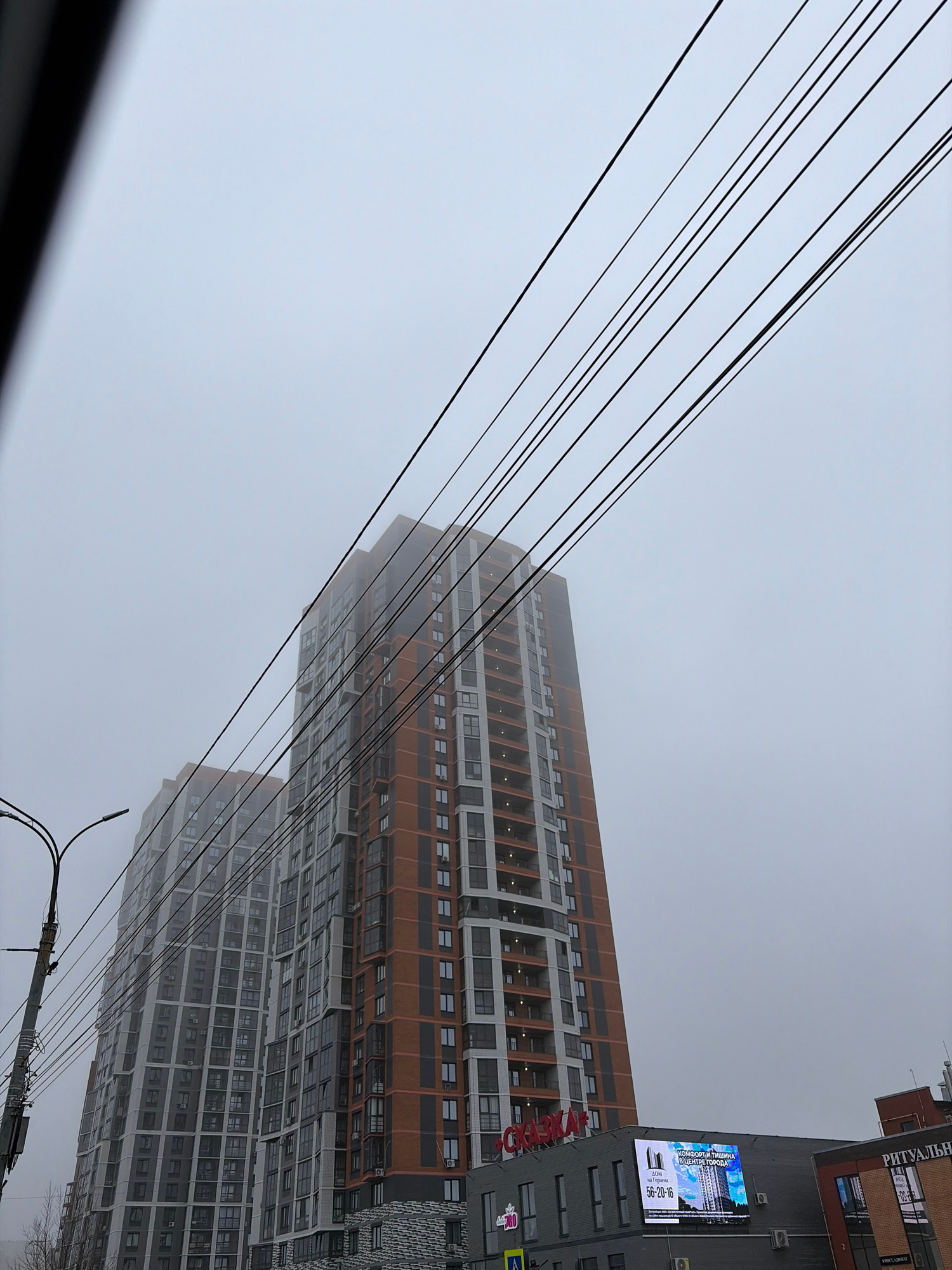 The image shows a street scene in Izhevsk, Russia, characterized by a heavy fog obscuring the view. A modern high-rise building dominates the frame, its façade partially visible through the mist. The…read more