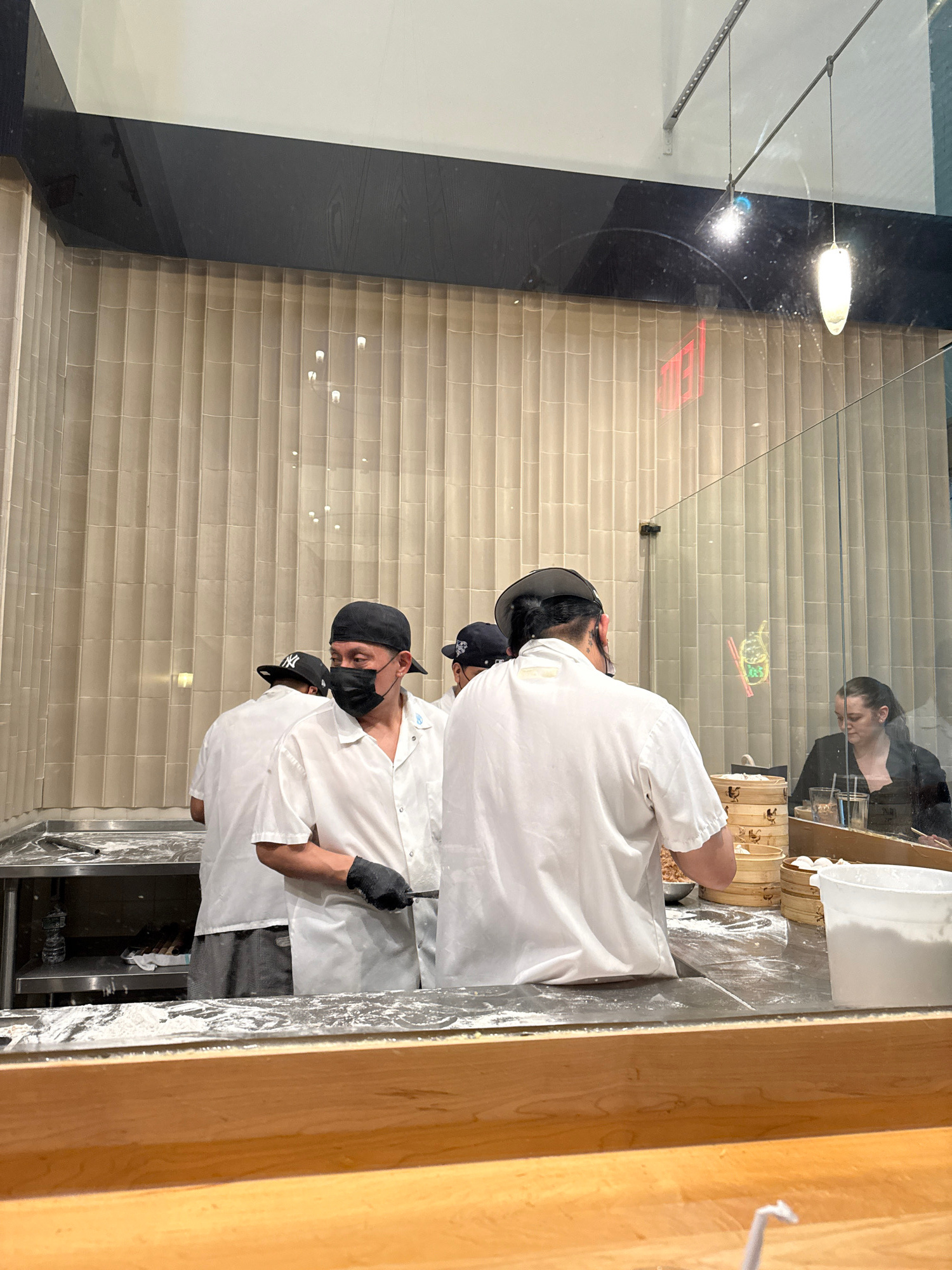 The image depicts a culinary scene, possibly in New York City, United States of America, as suggested by the architectural style of the building and the commercial nature of the setting. Three individ…read more