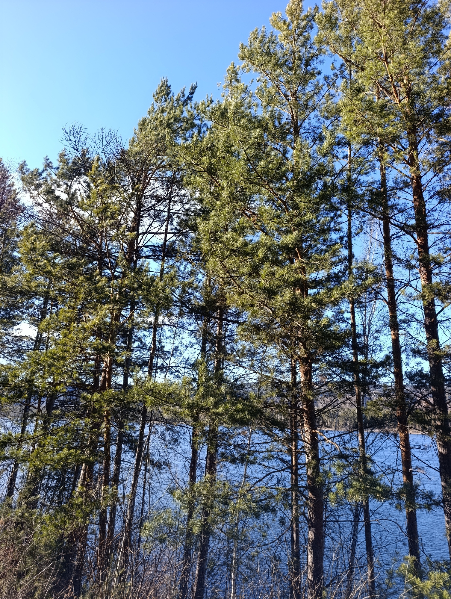 The image shows a view through a stand of pine trees towards a body of water, likely a part of the Yenisey River, on a bright, clear day in Krasnoyarsk, Russia. The sky is a deep blue, contrasting wit…read more