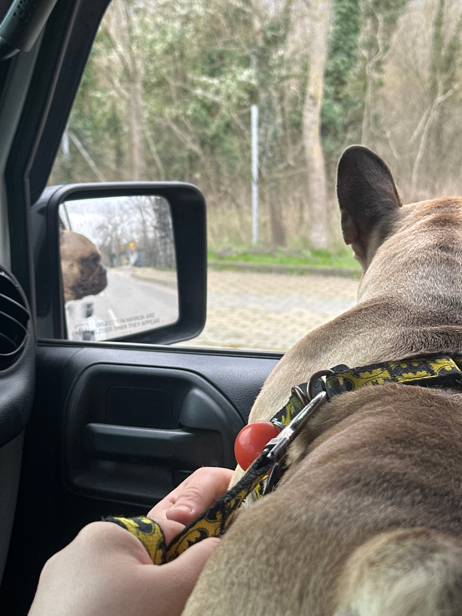 The image shows the interior of a car. A large, light-brown dog is partially visible in the foreground, its head and neck extending towards the top of the frame. The dog is wearing a black and yellow…read more