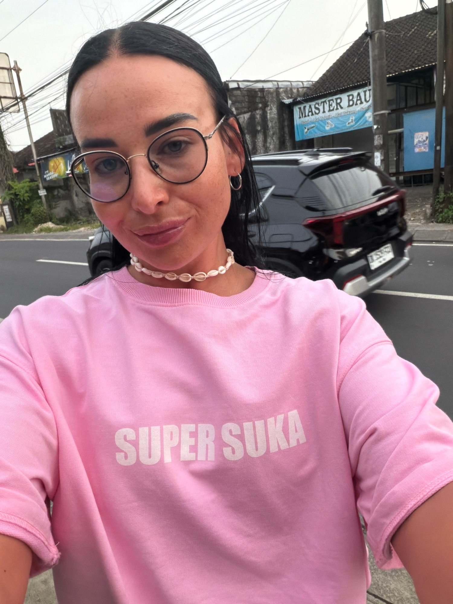 The scene captures an adult female subject taking a selfie outdoors in Ungasan, Indonesia. The subject, positioned centrally, presents with dark hair, gold-rimmed glasses, silver hoop earrings, and a…read more