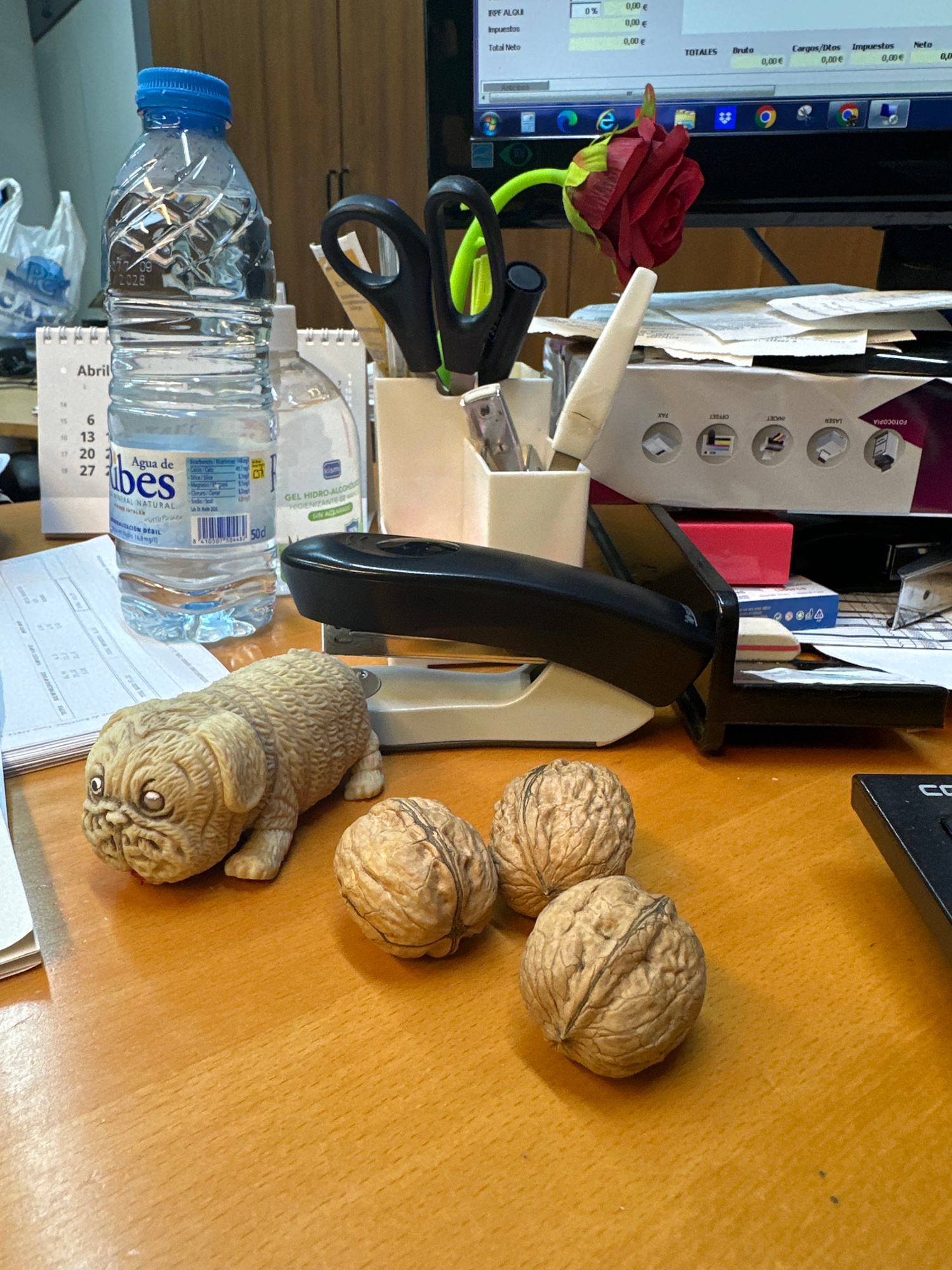 A cluttered desk is depicted in the image. On the desk, there are a variety of objects including a computer monitor, a red rose, a stapler, scissors, a water bottle labeled "Agua de Bes", a small figu…read more