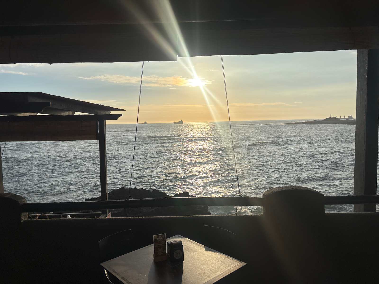 The image shows a view of the ocean through a partially enclosed space, likely a restaurant or patio. The sun is setting over the water, creating a bright glare. The ocean has moderate waves, reflecti…read more