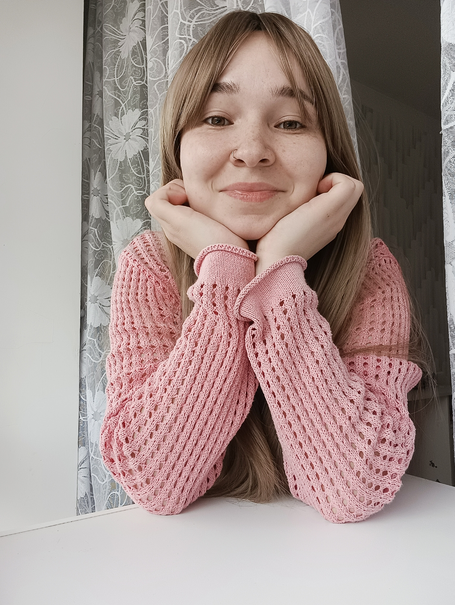 A young woman with light brown hair and freckles is posed indoors, resting her chin on her hands. She is wearing a pink knitted sweater with decorative sleeves. Behind her is a window with a sheer, fl…read more