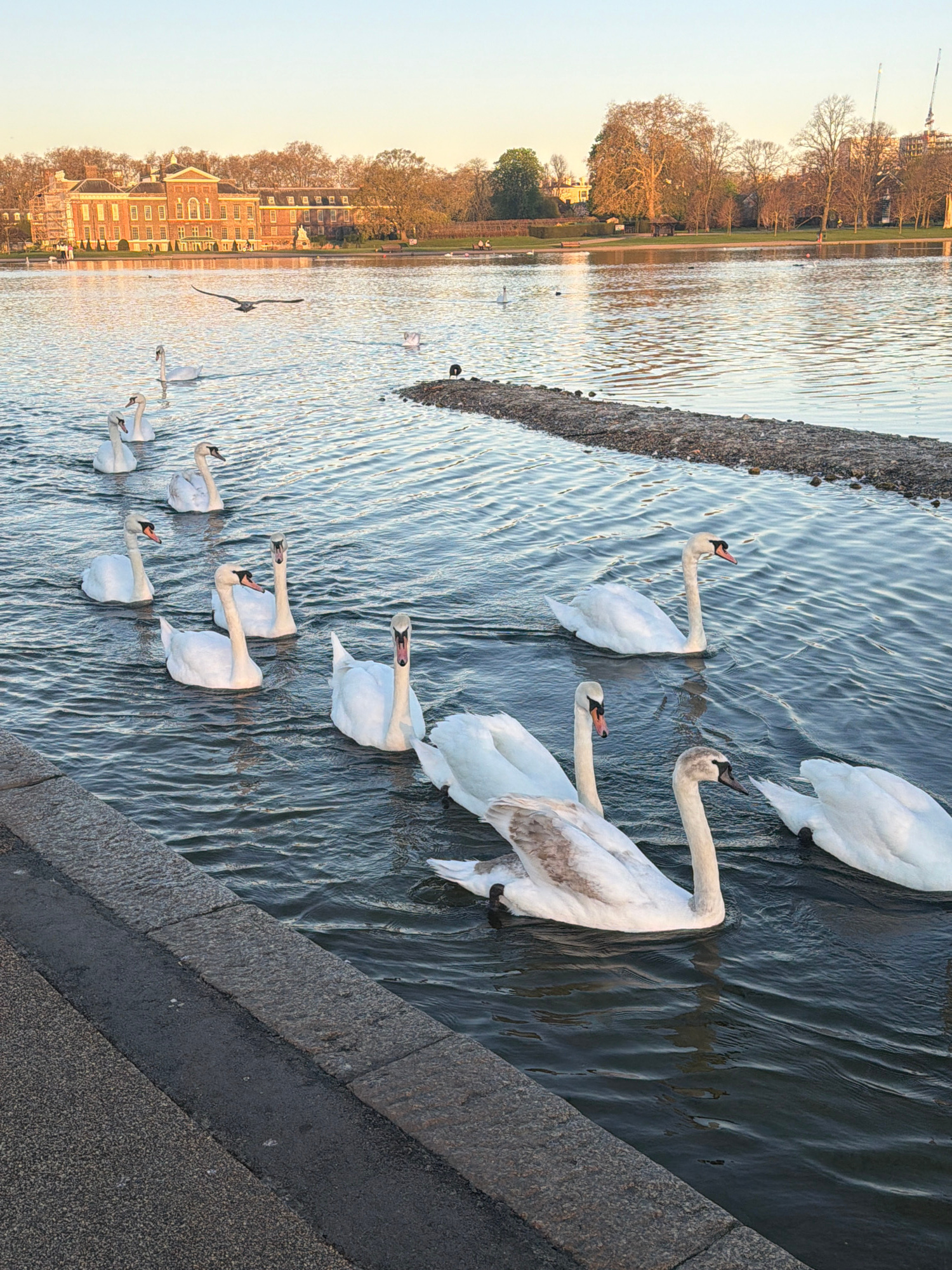 The image depicts a body of water in London, United Kingdom, likely a part of Kensington Gardens or Hyde Park given the presence of Kensington Palace in the background. A group of swans is gathered neβ¦read more