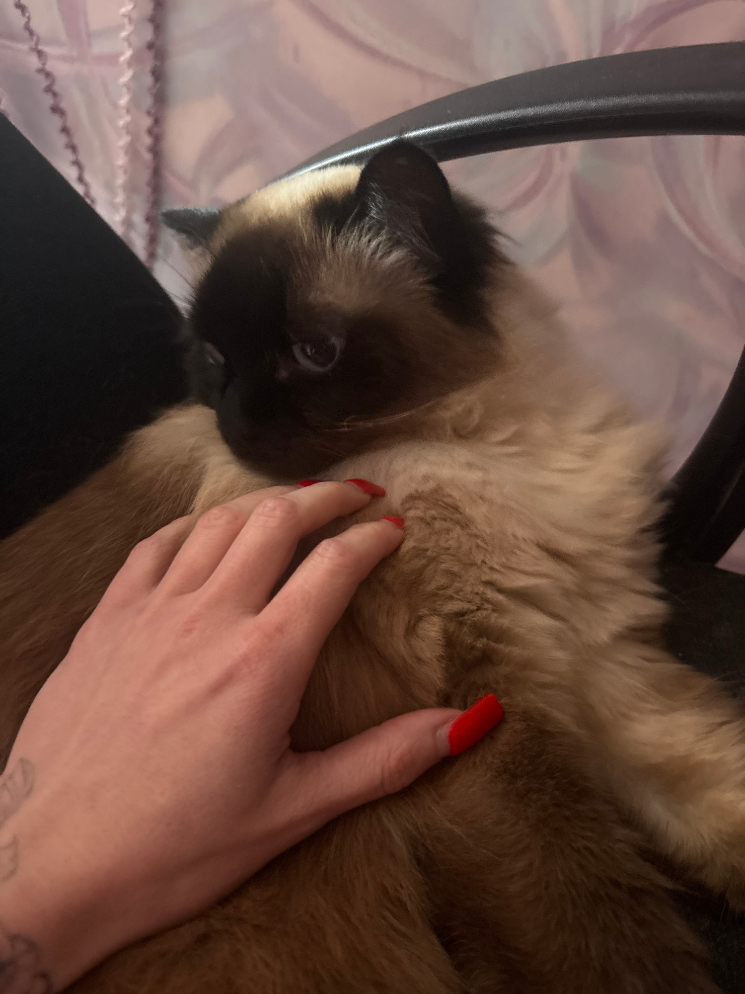 A light brown and black cat is lying on a person's lap in what appears to be a chair. The person is petting the cat with their right hand. The person has red fingernails. The background appears to be…read more