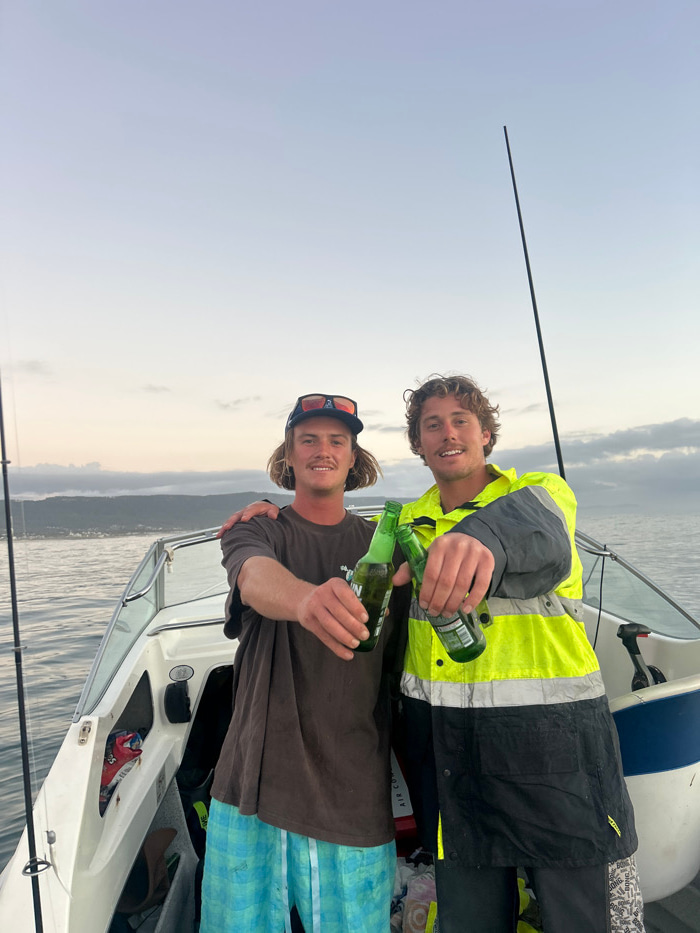 Two young men stand on a boat, each holding a green glass bottle. The man on the left wears a bright yellow safety jacket with gray accents and black shorts. The man on the right sports a brown long-s…read more