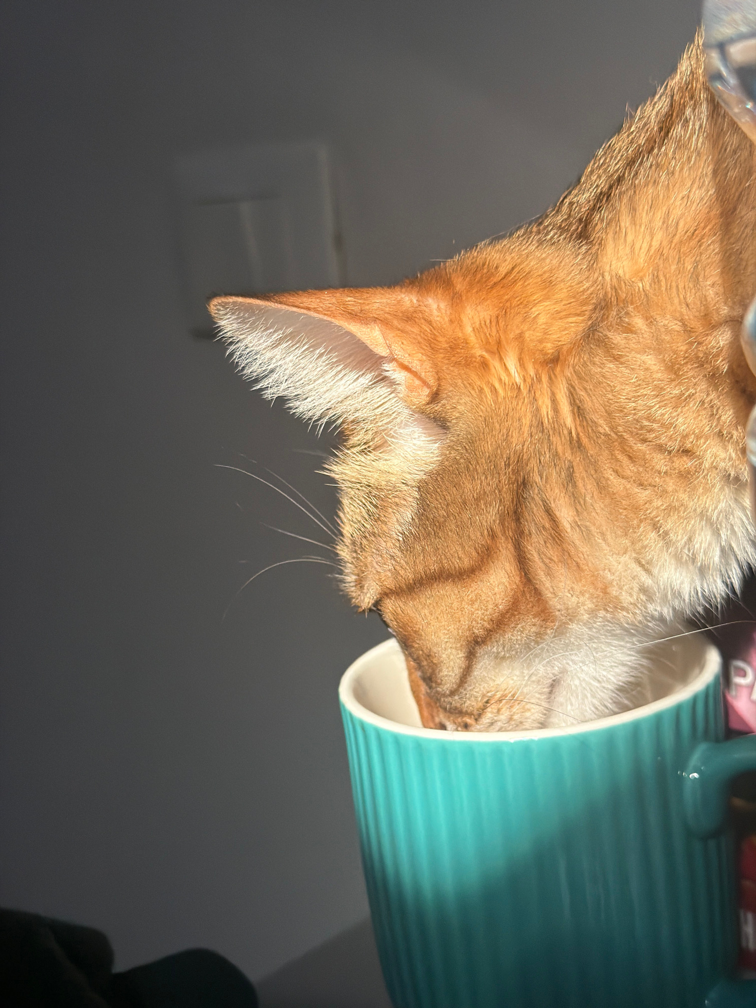 The upright image captures an intimate, domestic scene of an orange tabby cat intently engaging with a teal-colored mug. The cat's head is partially submerged in or close to the contents of the ribbed…read more