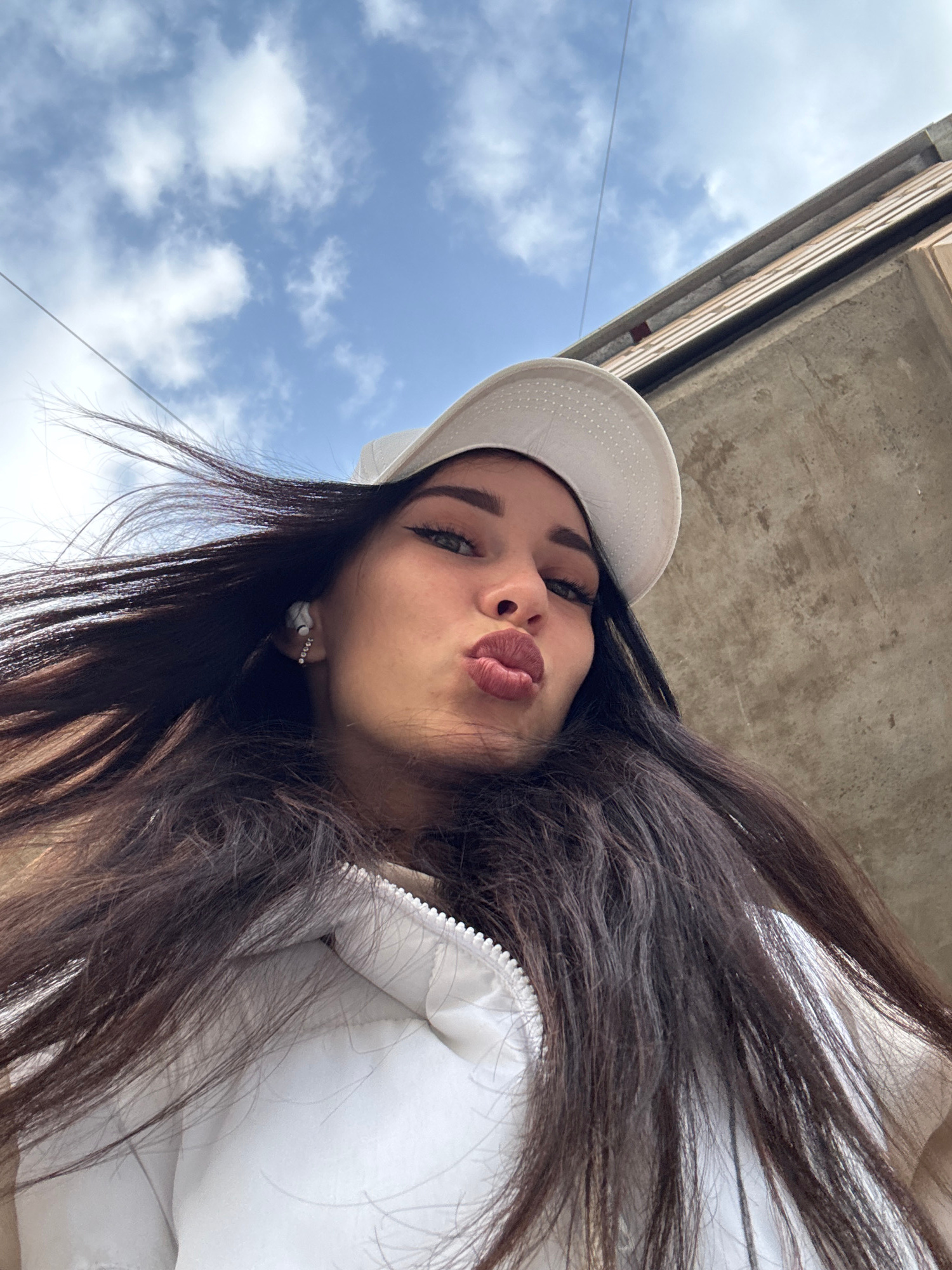A woman with dark hair and wearing a white hat and jacket is looking down at the camera. She is puckering her lips and appears to be taking a selfie. Above her is a grey concrete structure and a view…read more