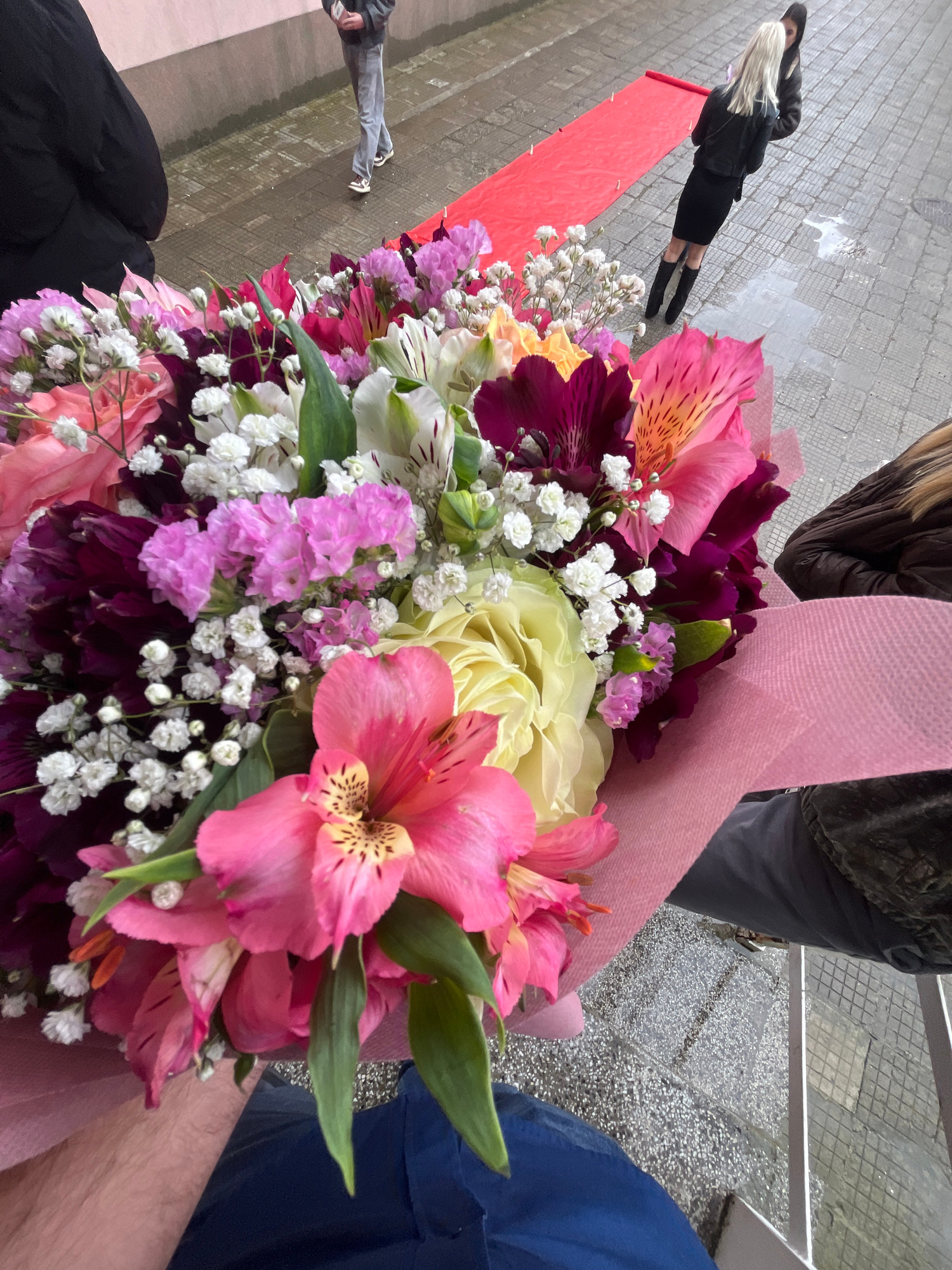 A bouquet of flowers, wrapped in pink paper, is held by a person wearing a blue shirt. The bouquet contains pink alstroemeria, white roses, purple flowers, and baby's breath. Another person is visibleβ¦read more