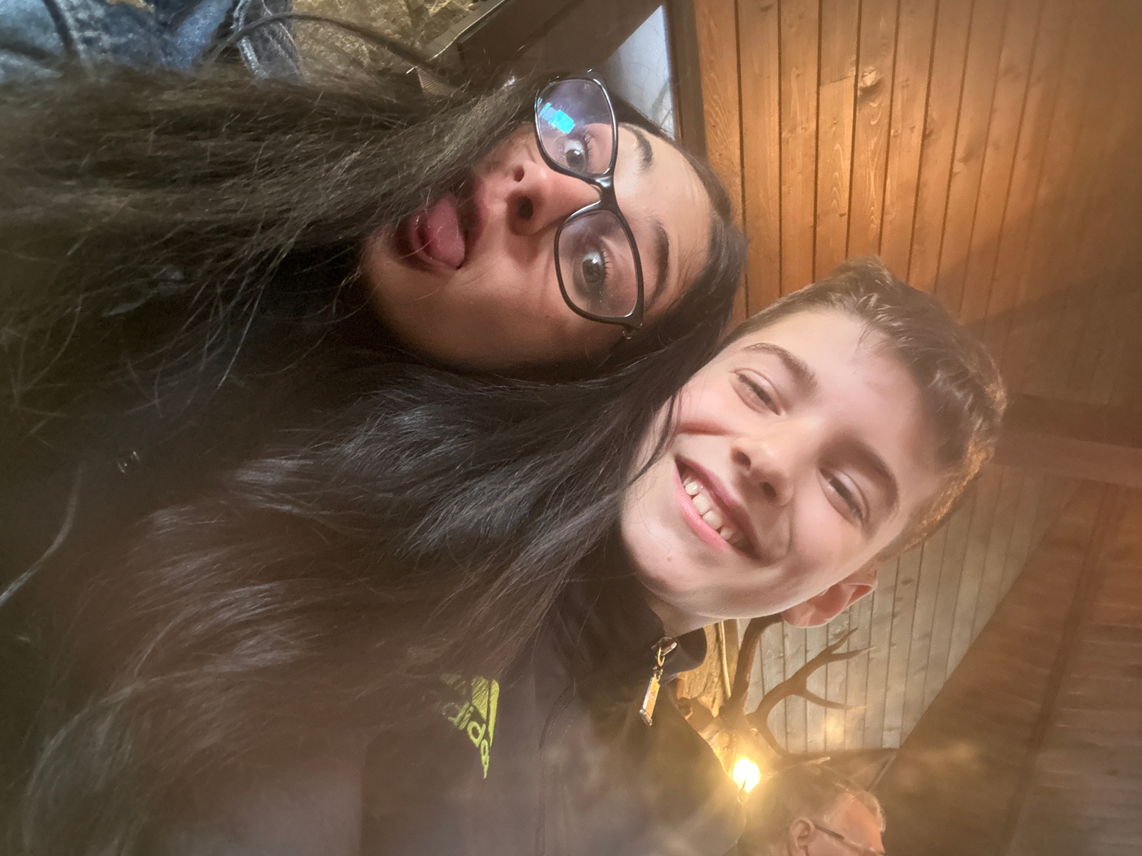 Two people are visible in a close-up selfie-style shot. One person has short light-colored hair and is smiling. The other person has long dark hair, glasses, and is sticking their tongue out. The back…read more