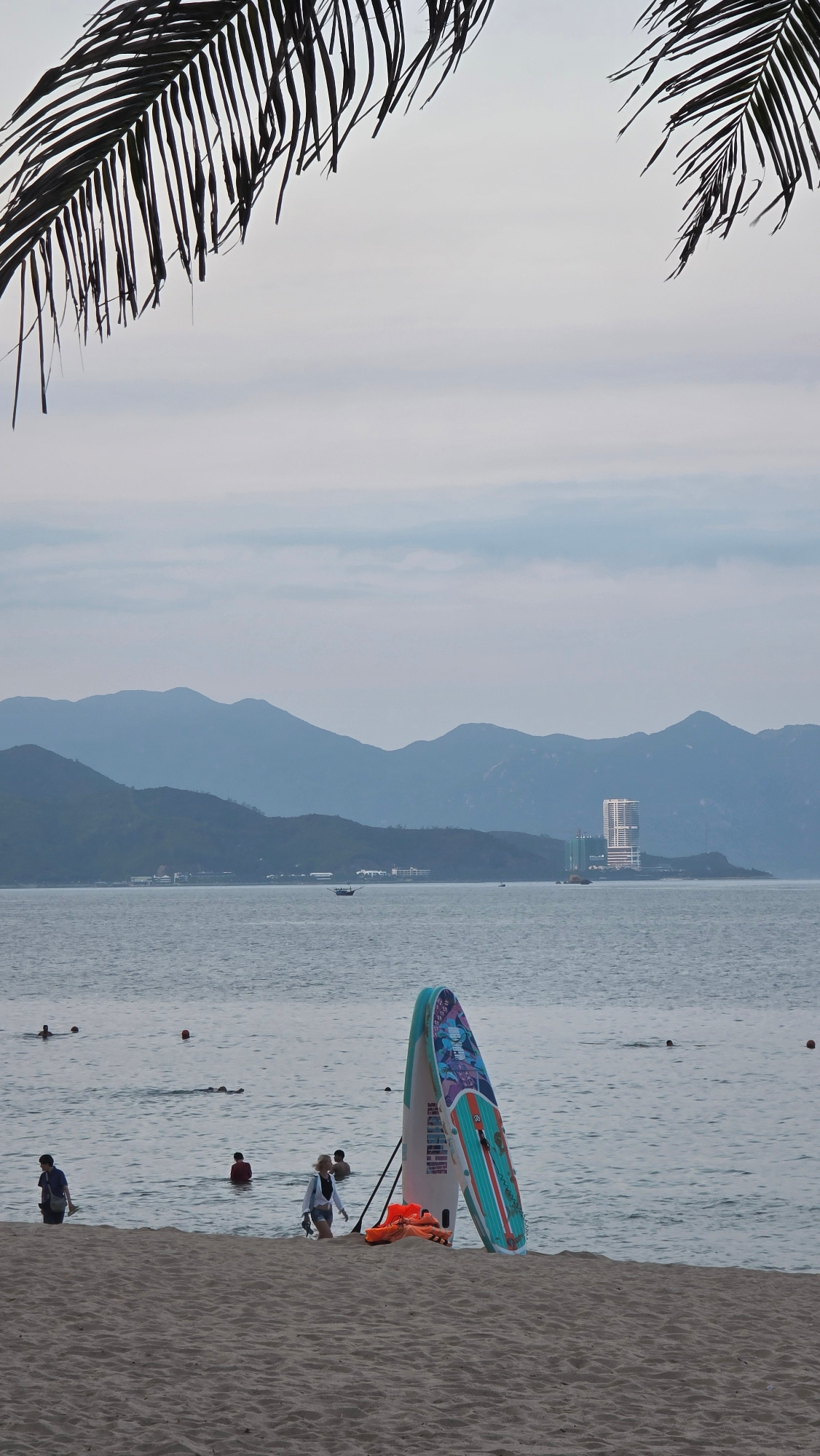 The image captures a serene beach scene, likely on an overcast or hazy day, with palm fronds framing the left side. The sky, occupying the upper portion, is a soft, uniform light grey-blue. In the mid…read more