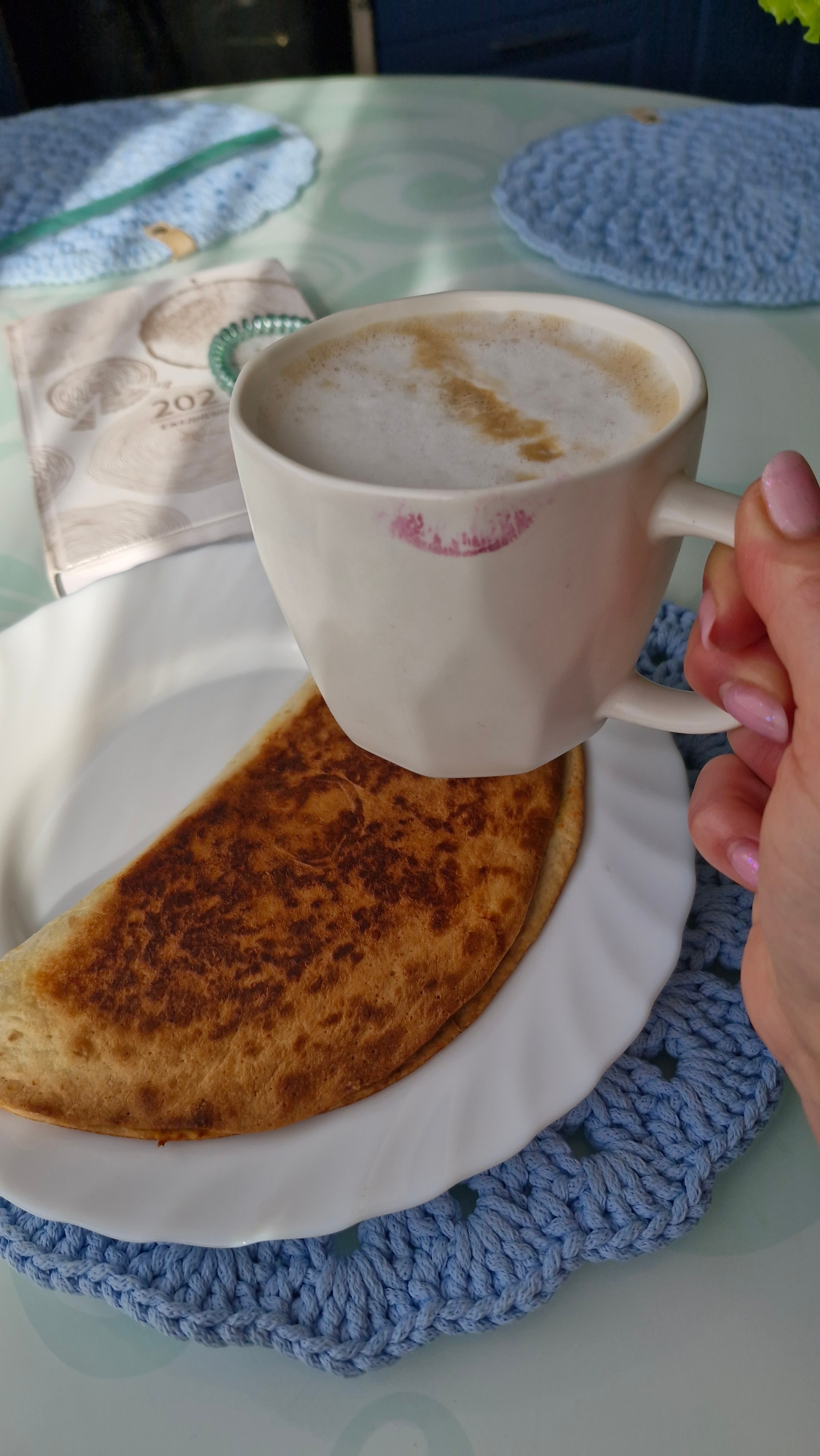 A person's hand holds a white ceramic mug with a visible lipstick mark, filled with a light brown beverage, presumably coffee. A white plate below holds a folded, golden-brown flatbread or pancake. Th…read more