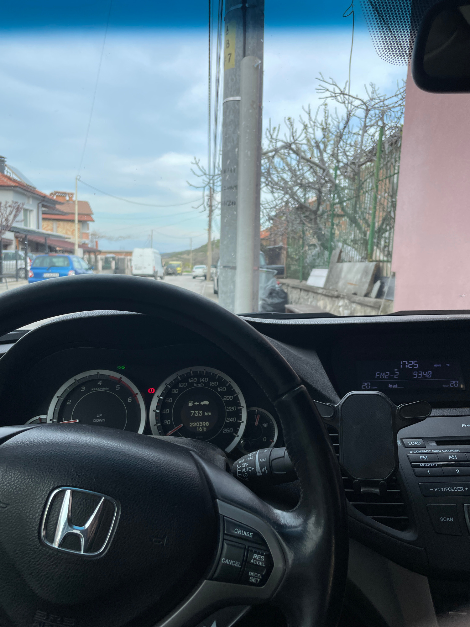 The image shows the interior of a car, specifically the dashboard and steering wheel of a Honda vehicle. The car is stationary, as indicated by the speedometer reading "0". The odometer shows "220398"…read more