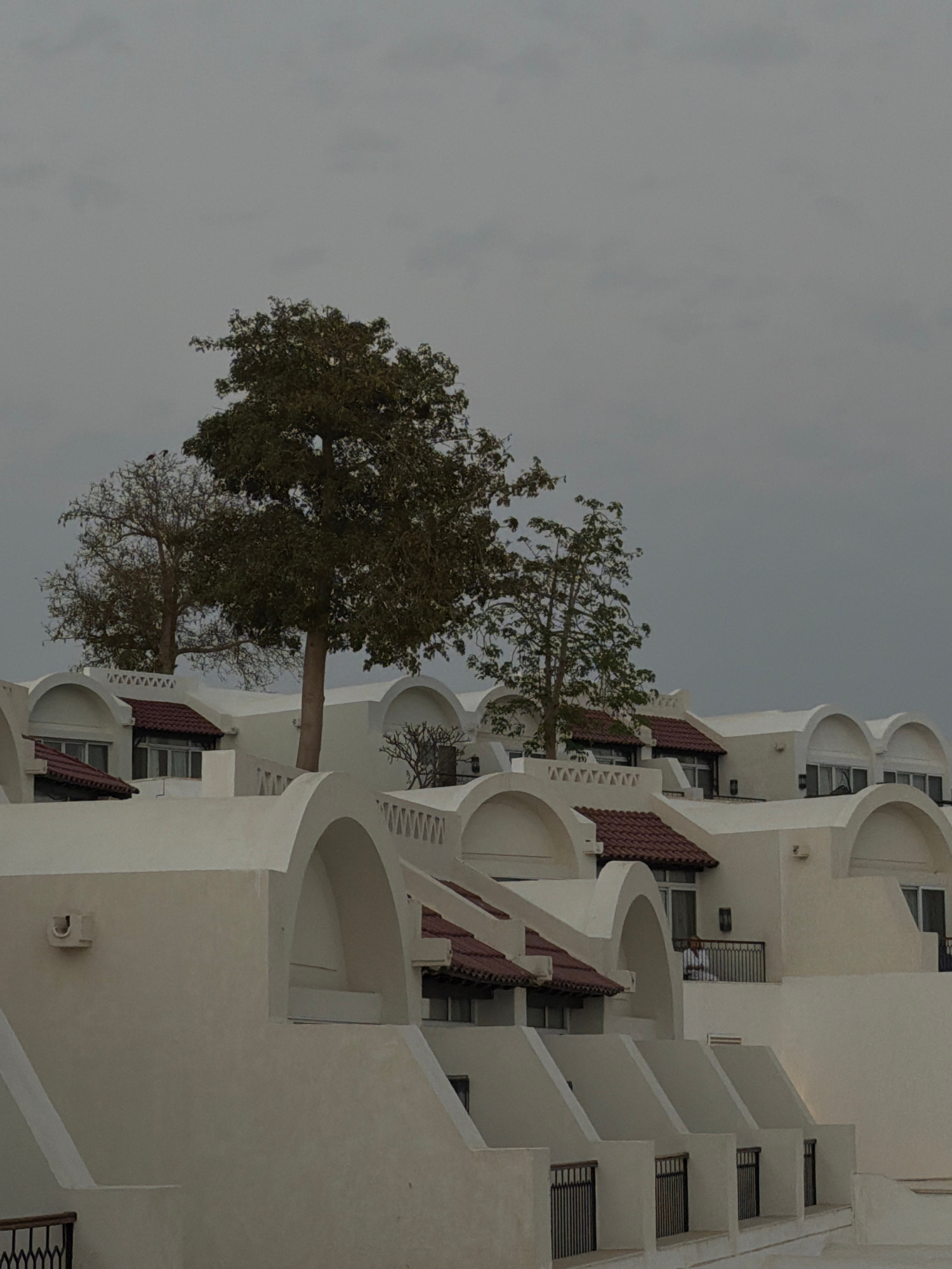 The image shows a multi-story building, likely a hotel or resort, in Sharm El Sheikh, Egypt. The building is white with arched balconies and windows. A tree with green foliage is positioned in front o…read more