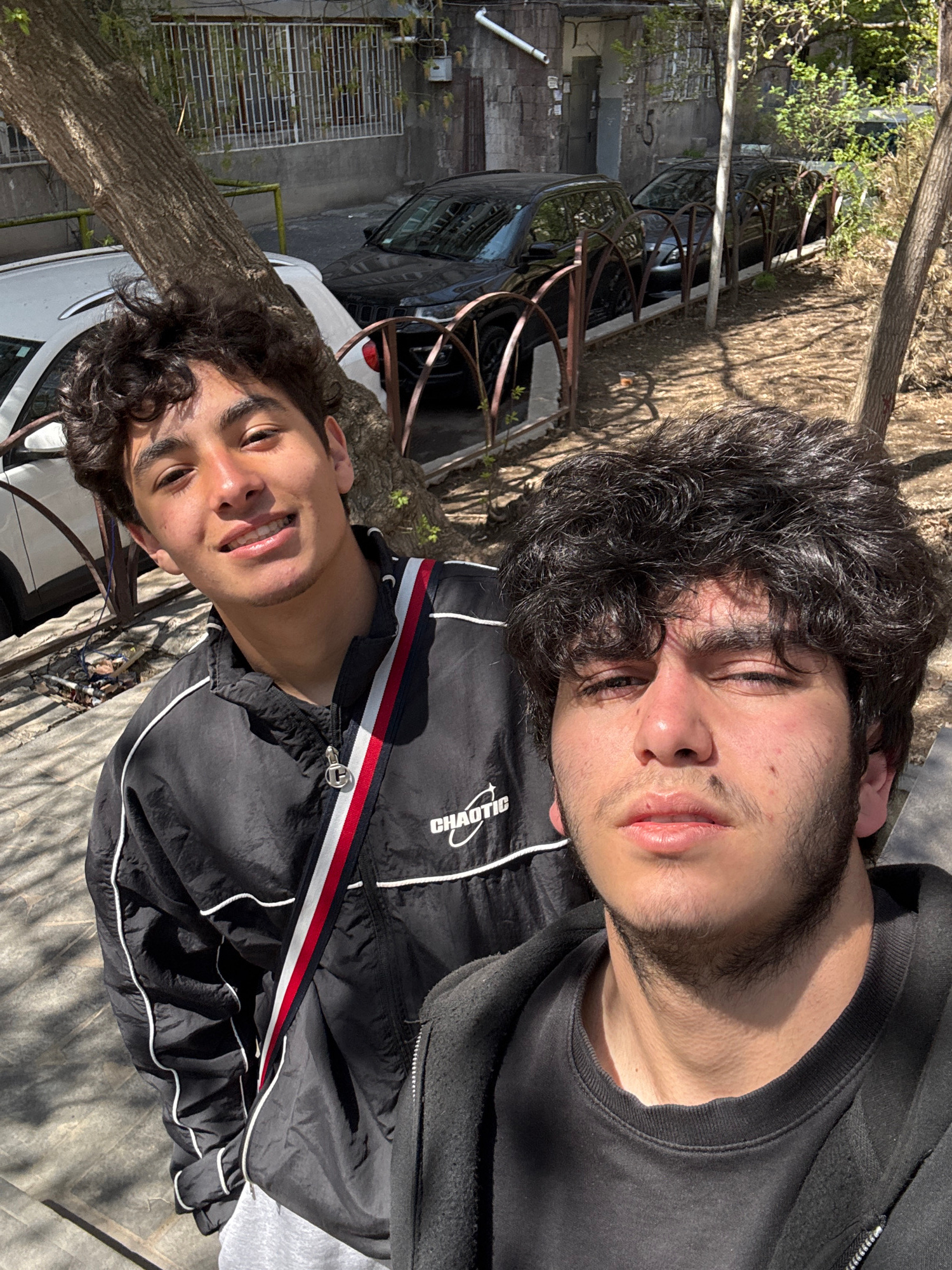 The image shows two young men in Yerevan, Armenia, seemingly posing for a selfie outdoors. One man is wearing a black "CHAOTIC" jacket with white and red stripes, while the other wears a black sweatsh…read more