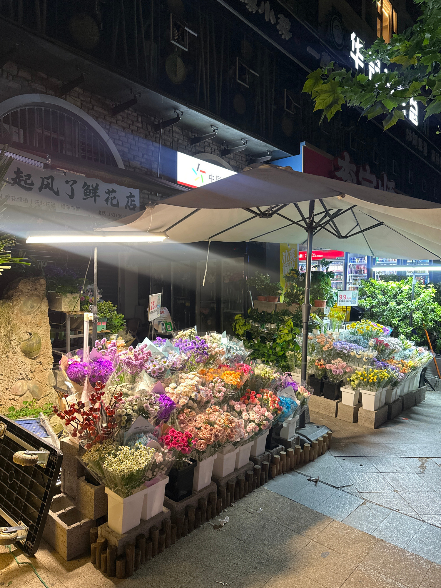 The image captures a street scene in Chongqing High-tech Zone, China, at night, featuring a flower shop. Numerous bouquets of various colors are displayed on tiered blocks, positioned along the edge o…read more