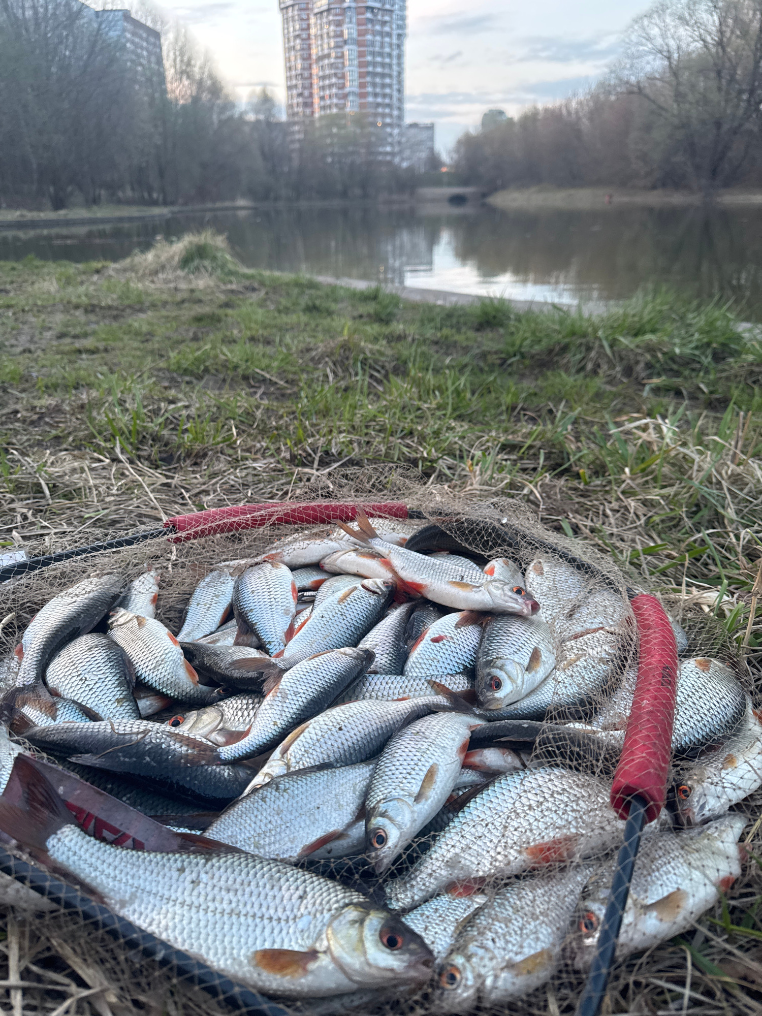 The image depicts a fishing net filled with numerous roach fish, laid on grass beside a body of water. The buildings reflected in the water suggest an urban environment, likely in Moscow, Russia. The…read more