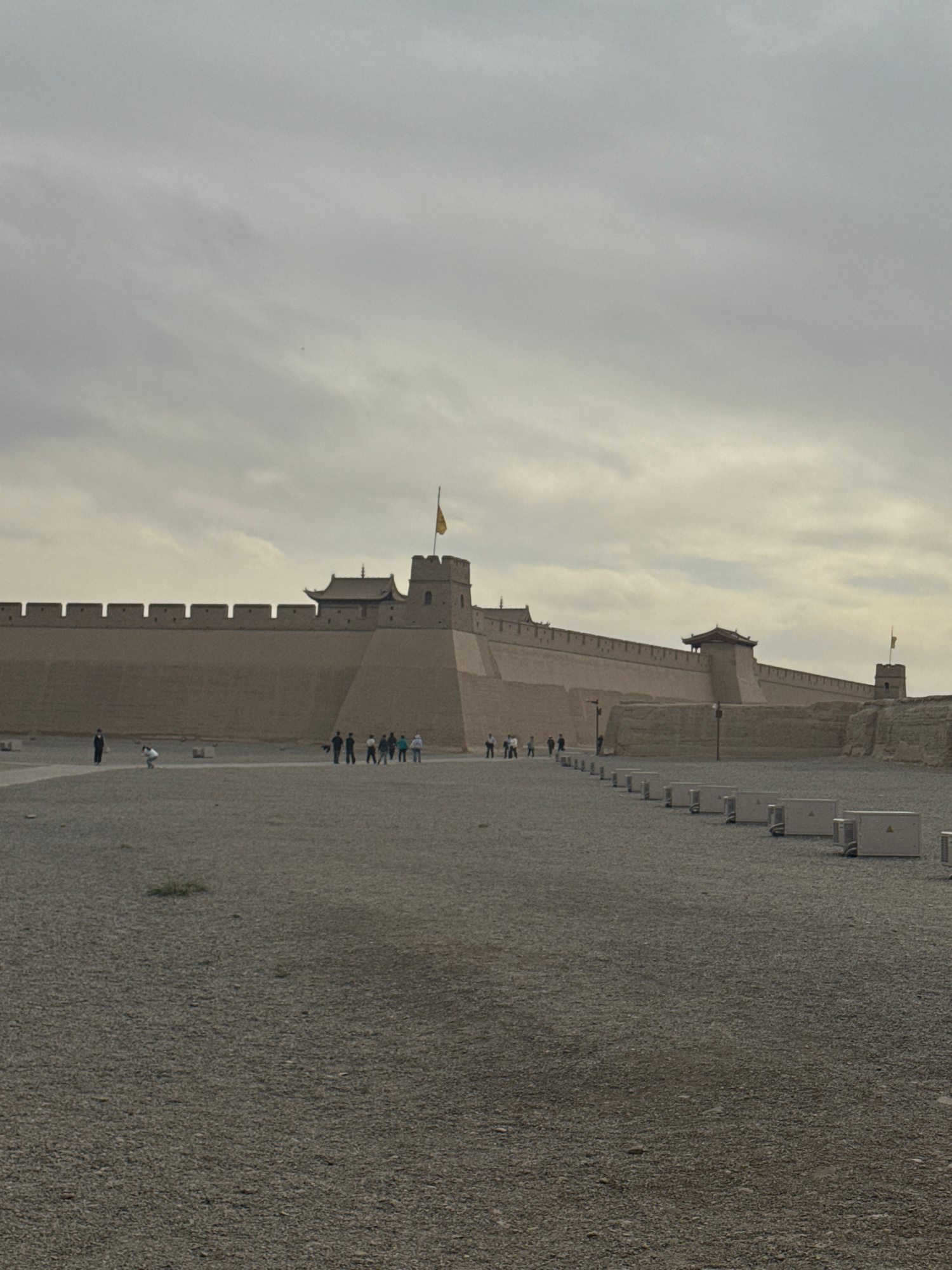 This image, taken in Jiayuguan, China, captures a long, imposing section of what appears to be an ancient fortress wall, consistent with the Jiayuguan Fort, a significant part of the Great Wall. The w…read more